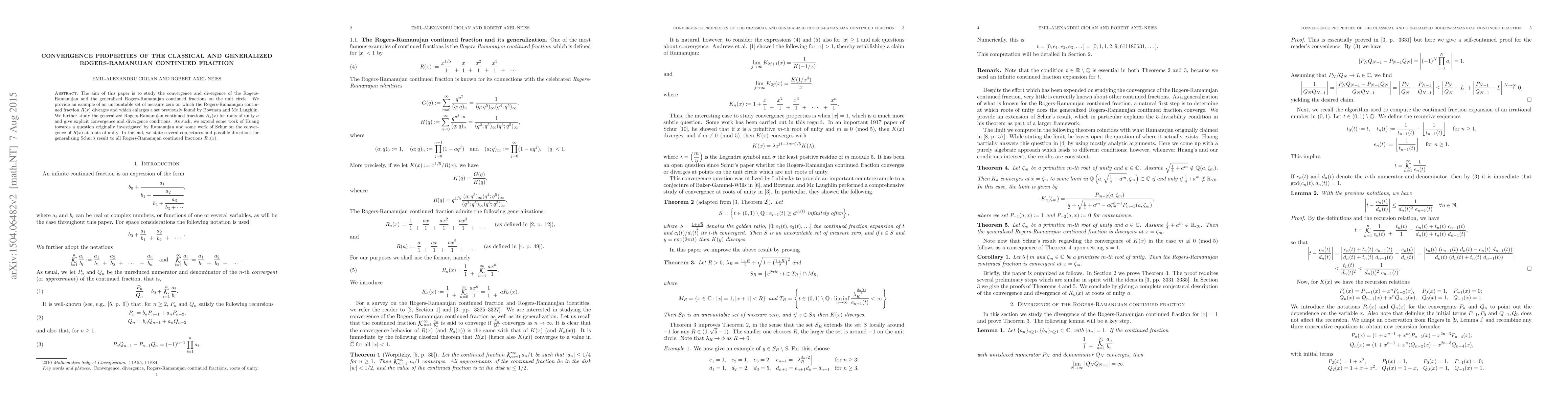 The aim of this paper is to study the convergence and divergence of the Rogers-Ramanujan and the generalized Rogers-Ramanujan continued fractions on the unit circle. We provide an example of an uncountable set of measure zero on which the Rogers-Ramanujan continued fraction $R(x)$ diverges and which enlarges a set previously found by Bowman and Mc Laughlin. We further study the generalized Rogers-Ramanujan continued fractions $R_a(x)$ for roots of unity $a$ and give explicit convergence and divergence conditions. As such, we extend some work of Huang towards a question originally investigated by Ramanujan and some work of Schur on the convergence of $R(x)$ at roots of unity. In the end, we state several conjectures and possible directions for generalizing Schur's result to all Rogers-Ramanujan continued fractions $R_a(x)$.