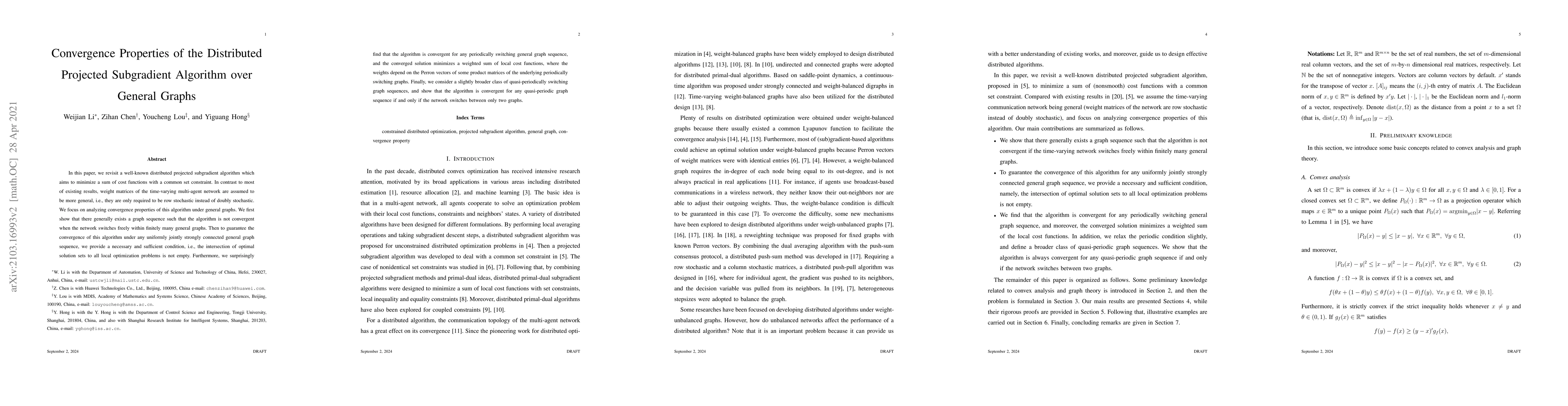 In this paper, we revisit a well-known distributed projected subgradient algorithm which aims to minimize a sum of cost functions with a common set constraint. In contrast to most of existing results, weight matrices of the time-varying multi-agent network are assumed to be more general, i.e., they are only required to be row stochastic instead of doubly stochastic. We focus on analyzing convergence properties of this algorithm under general graphs. We first show that there generally exists a graph sequence such that the algorithm is not convergent when the network switches freely within finitely many general graphs. Then to guarantee the convergence of this algorithm under any uniformly jointly strongly connected general graph sequence, we provide a necessary and sufficient condition, i.e., the intersection of optimal solution sets to all local optimization problems is not empty. Furthermore, we surprisingly find that the algorithm is convergent for any periodically switching general graph sequence, and the converged solution minimizes a weighted sum of local cost functions, where the weights depend on the Perron vectors of some product matrices of the underlying periodically switching graphs. Finally, we consider a slightly broader class of quasi-periodically switching graph sequences, and show that the algorithm is convergent for any quasi-periodic graph sequence if and only if the network switches between only two graphs.