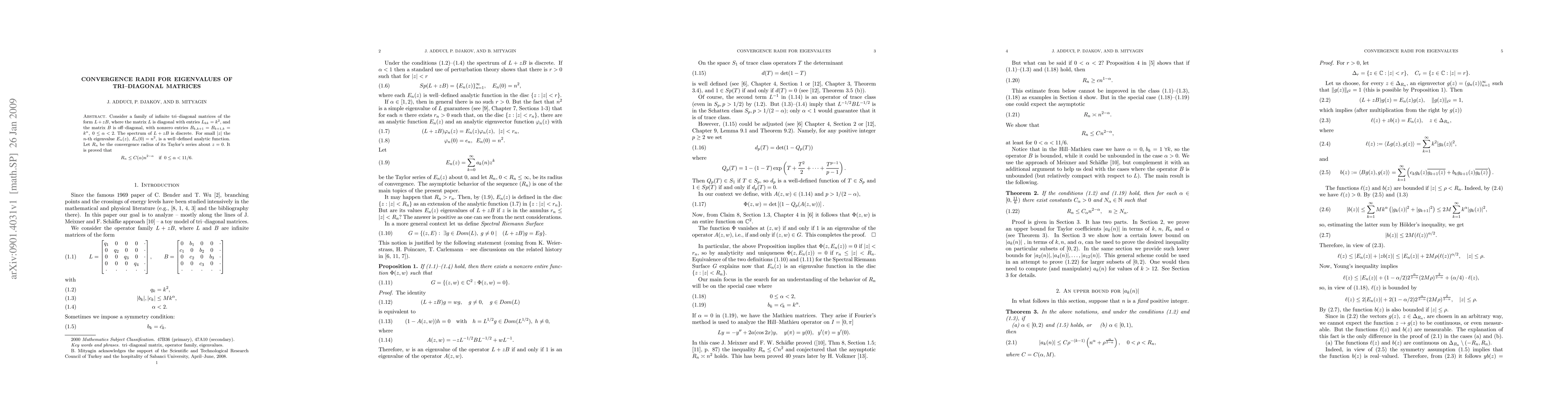 This paper investigates the convergence radii of the eigenvalues for a family of infinite tri-diagonal matrices of the form $L+ zB$, where $L$ is diagonal and $B$ has specific off-diagonal entries. It is shown that the convergence radius $R_n$ of the Taylor series for the $n$-th eigenvalue is bounded by $C(\alpha) n^{2-\alpha}$ for $0 \leq \alpha < 11/6$.