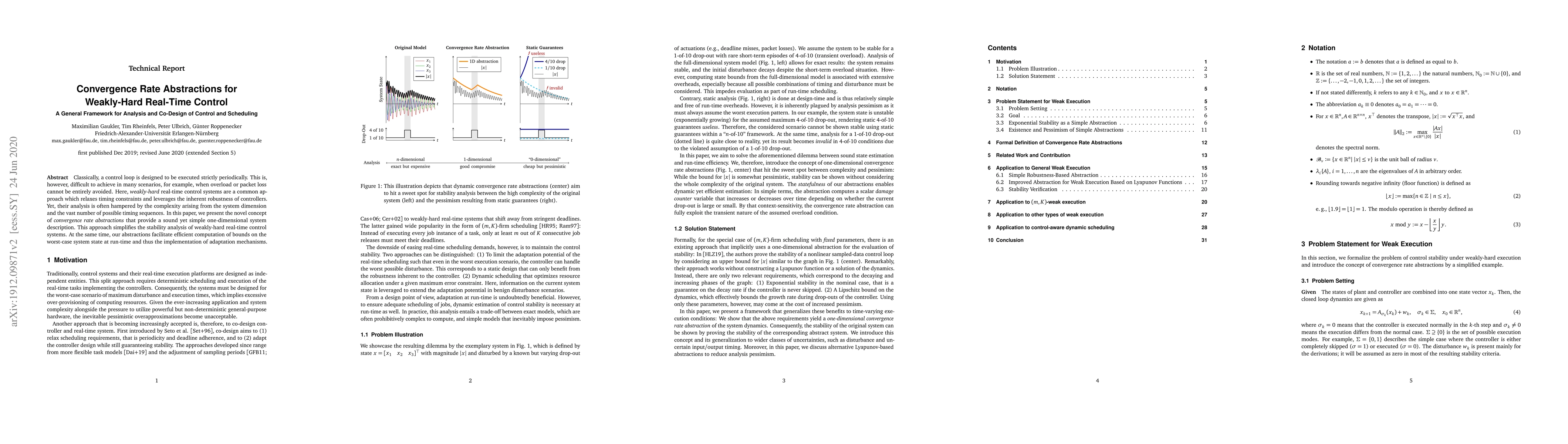Classically, a control loop is designed to be executed strictly periodically. This is, however, difficult to achieve in many scenarios, for example, when overload or packet loss cannot be entirely avoided. Here, weakly-hard real-time control systems are a common approach which relaxes timing constraints and leverages the inherent robustness of controllers. Yet, their analysis is often hampered by the complexity arising from the system dimension and the vast number of possible timing sequences. In this paper, we present the novel concept of convergence rate abstractions that provide a sound yet simple one-dimensional system description. This approach simplifies the stability analysis of weakly-hard real-time control systems. At the same time, our abstractions facilitate efficient computation of bounds on the worst-case system state at run-time and thus the implementation of adaptation mechanisms.