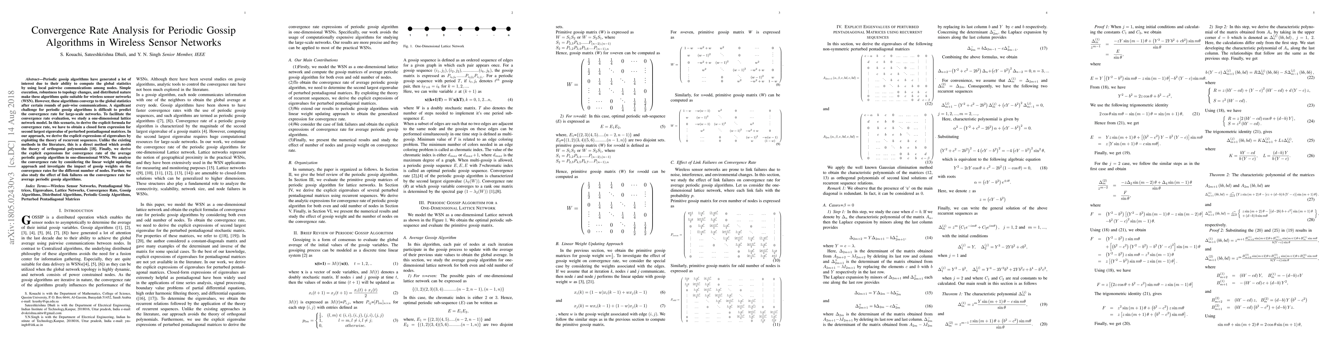 Periodic gossip algorithms have generated a lot of interest due to their ability to compute the global statistics by using local pairwise communications among nodes. Simple execution, robustness to topology changes, and distributed nature make these algorithms quite suitable for wireless sensor networks (WSN). However, these algorithms converge to the global statistics after certain rounds of pair-wise communications. A significant challenge for periodic gossip algorithms is difficult to predict the convergence rate for large-scale networks. To facilitate the convergence rate evaluation, we study a one-dimensional lattice network model. In this scenario, to derive the explicit formula for convergence rate, we have to obtain a closed form expression for second largest eigenvalue of perturbed pentadiagonal matrices. In our approach, we derive the explicit expressions of eigenvalues by exploiting the theory of recurrent sequences. Unlike the existing methods in the literature, this is a direct method which avoids the theory of orthogonal polynomials [18]. Finally, we derive the explicit expressions for convergence rate of the average periodic gossip algorithm in one-dimensional WSNs. We analyze the convergence rate by considering the linear weight updating approach and investigate the impact of gossip weights on the convergence rates for a different number of nodes. Further, we also study the effect of link failures on the convergence rate for average periodic gossip algorithms.