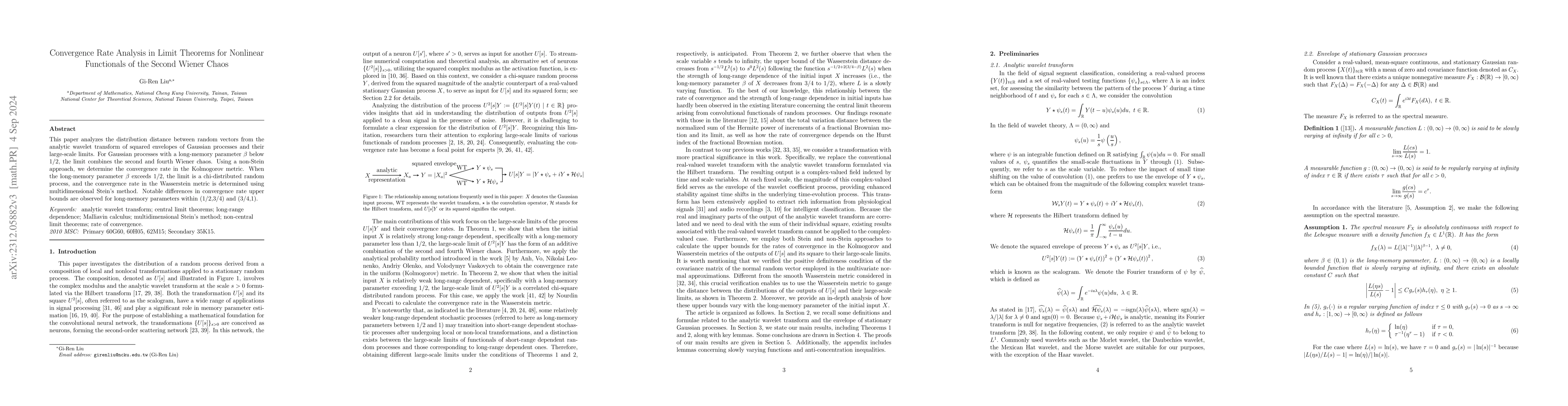 The purpose of this paper is to analyze the distribution distance between random vectors derived from the magnitude of the analytic wavelet transform of the squared envelopes of Gaussian processes and their large-scale limits. When the Hurst index of the underlying Gaussian process falls below 1/2, the large-scale limit takes the form of a combination of the second and fourth Wiener chaos. In this case, we employ the non-Stein approach to determine the convergence rate in the Kolmogorov metric. In scenarios where the Hurst index of the underlying Gaussian process exceeds 1/2, the large-scale limit is a correlated chi-distributed random process with two degrees of freedom. The convergence rate in the Wasserstein metric is derived through the application of Malliavin calculus and multidimensional Stein's method. Although the large-scale limits are the same for Hurst indices within the interval (1/2,1), notable differences in the upper bounds of convergence rates are observed among Hurst indices falling within the subintervals (1/2,3/4) and (3/4,1).