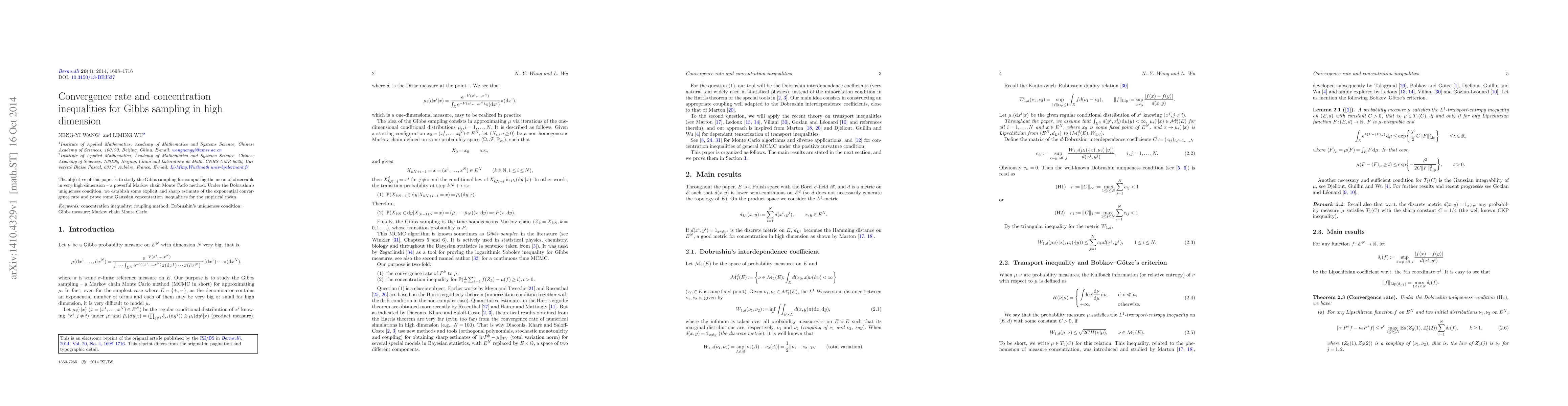 This paper investigates Gibbs sampling for high-dimensional Markov chain Monte Carlo methods, providing explicit convergence rate estimates and Gaussian concentration inequalities under Dobrushin's uniqueness condition.