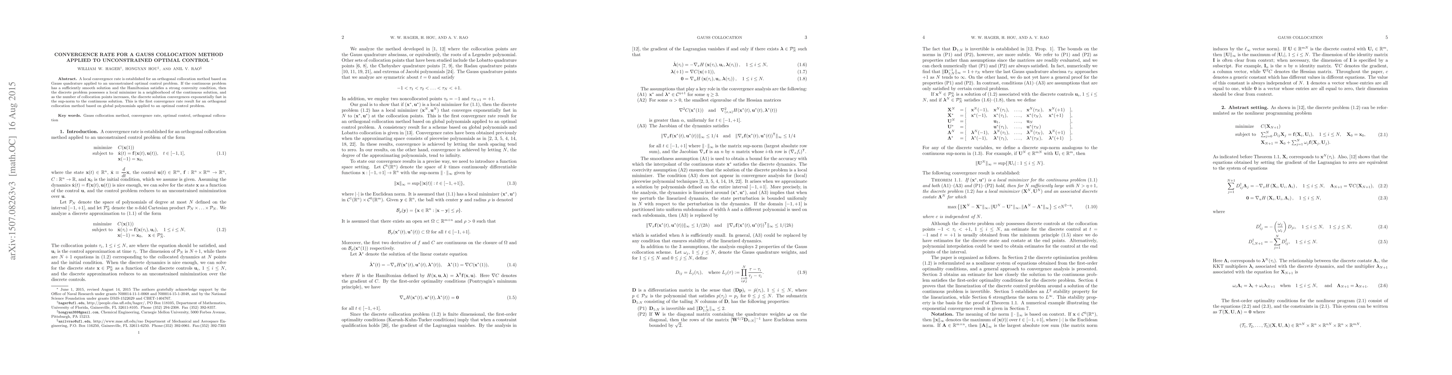 This paper establishes a local convergence rate for an orthogonal collocation method using Gauss quadrature for unconstrained optimal control problems. Under conditions of smooth solutions and strong convexity, the method converges exponentially fast to the continuous solution as the number of collocation points increases.