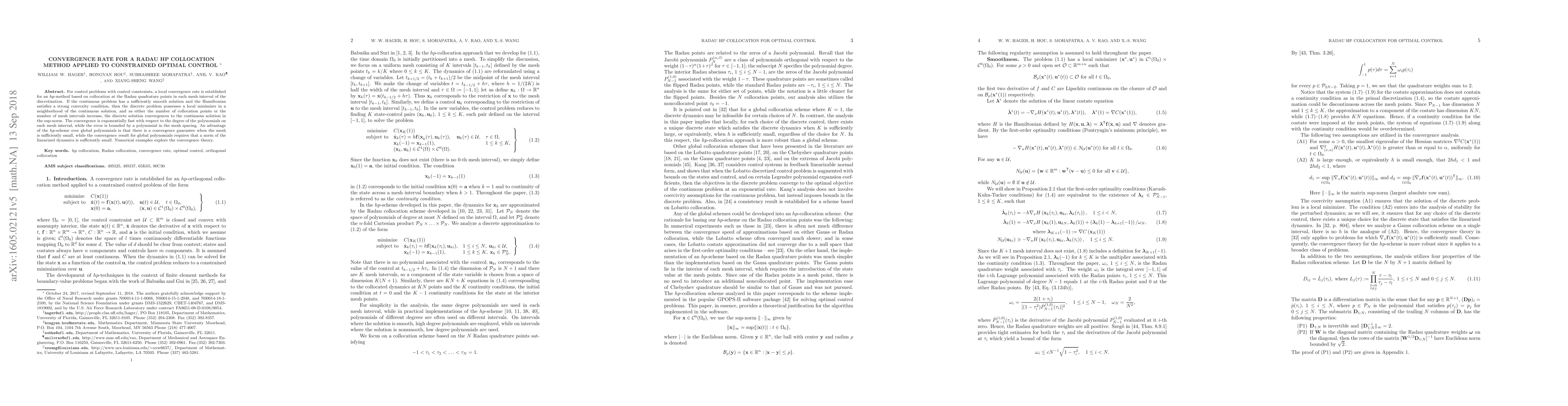 This paper establishes a convergence rate for a Radau hp collocation method applied to constrained optimal control problems, demonstrating exponential convergence with respect to polynomial degree and bounded error relative to mesh spacing. The $hp$-scheme offers a convergence guarantee even for small meshes, unlike global polynomial methods.
