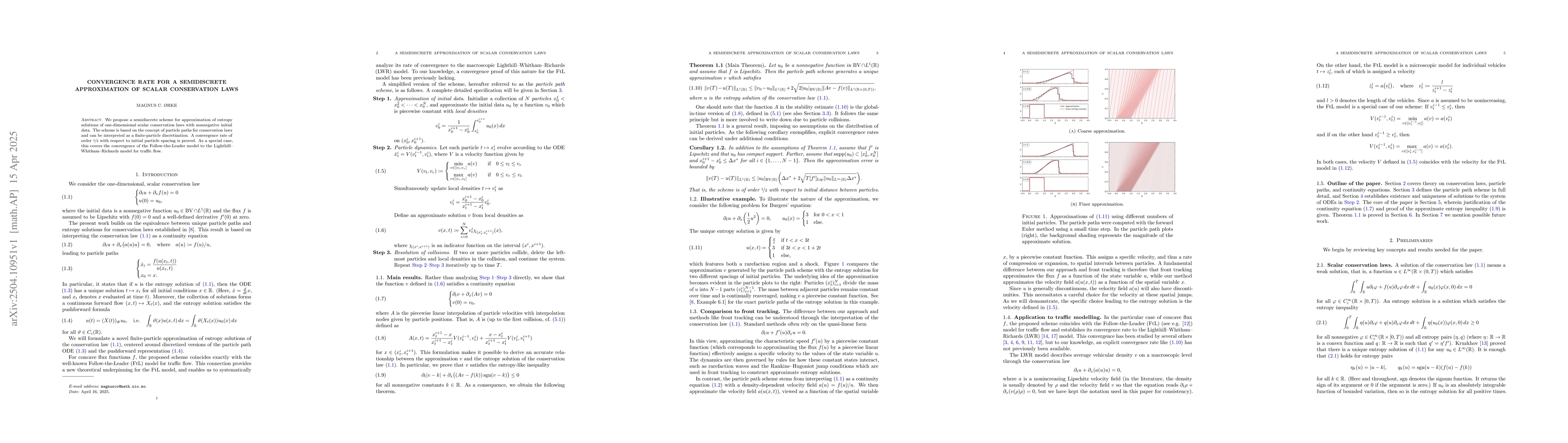 We propose a semidiscrete scheme for approximation of entropy solutions of one-dimensional scalar conservation laws with nonnegative initial data. The scheme is based on the concept of particle paths for conservation laws and can be interpreted as a finite-particle discretization. A convergence rate of order $1/2$ with respect to initial particle spacing is proved. As a special case, this covers the convergence of the Follow--the--Leader model to the Lighthill--Whitham--Richards model for traffic flow.