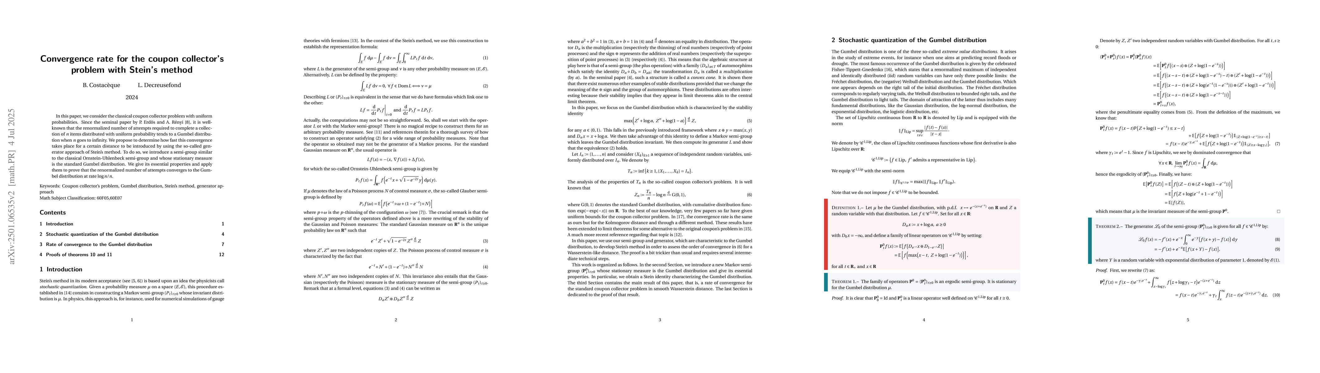 This paper investigates the convergence rate for the coupon collector's problem using Stein's method. It shows that the renormalized number of attempts to complete a collection converges to a Gumbel distribution at a rate of $\log n/n$.