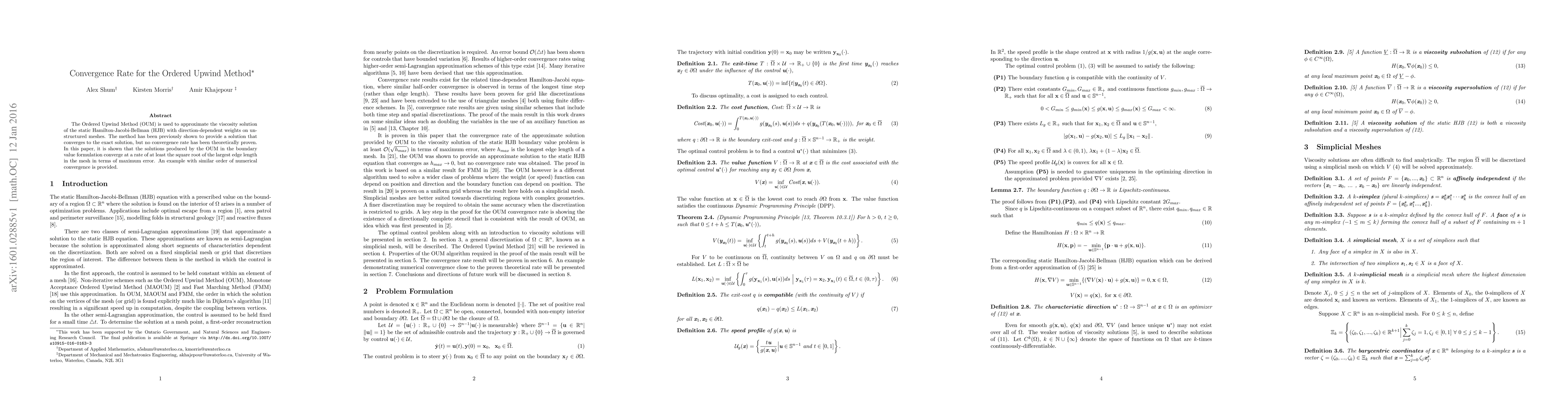 The Ordered Upwind Method (OUM) is used to approximate the viscosity solution of the static Hamilton-Jacobi-Bellman (HJB) with direction-dependent weights on unstructured meshes. The method has been previously shown to provide a solution that converges to the exact solution, but no convergence rate has been theoretically proven. In this paper, it is shown that the solutions produced by the OUM in the boundary value formulation converge at a rate of at least the square root of the largest edge length in the mesh in terms of maximum error. An example with similar order of numerical convergence is provided.