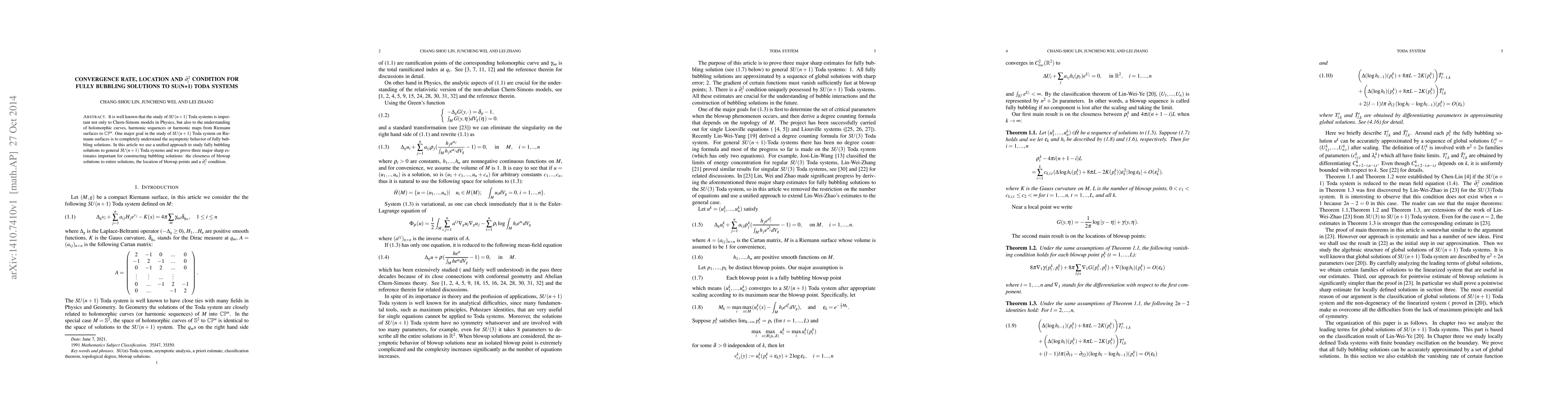 It is well known that the study of $SU(n+1)$ Toda systems is important not only to Chern-Simons models in Physics, but also to the understanding of holomorphic curves, harmonic sequences or harmonic maps from Riemann surfaces to $\mathbb C\mathbb P^n$. One major goal in the study of $SU(n+1)$ Toda system on Riemann surfaces is to completely understand the asymptotic behavior of fully bubbling solutions. In this article we use a unified approach to study fully bubbling solutions to general $SU(n+1)$ Toda systems and we prove three major sharp estimates important for constructing bubbling solutions: the closeness of blowup solutions to entire solutions, the location of blowup points and a $\partial_z^2$ condition.
