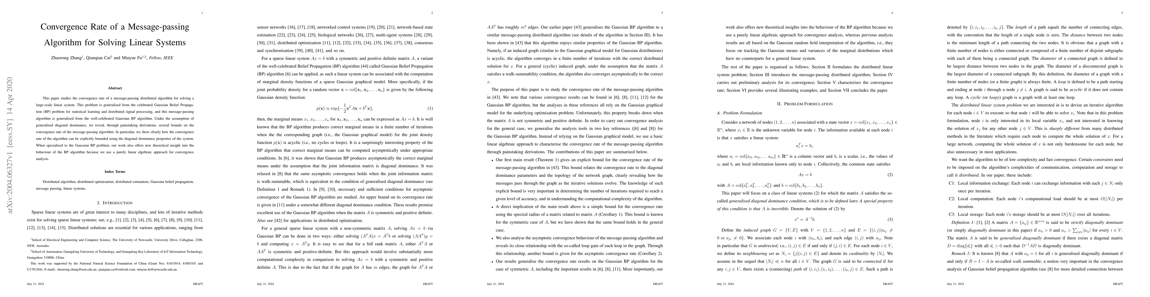 This paper investigates the convergence rate of a message-passing algorithm for solving large-scale linear systems, generalizing the Gaussian Belief Propagation method. It establishes bounds on the algorithm's convergence rate under generalised diagonal dominance, offering new insights into the Gaussian BP problem through a linear algebraic approach.