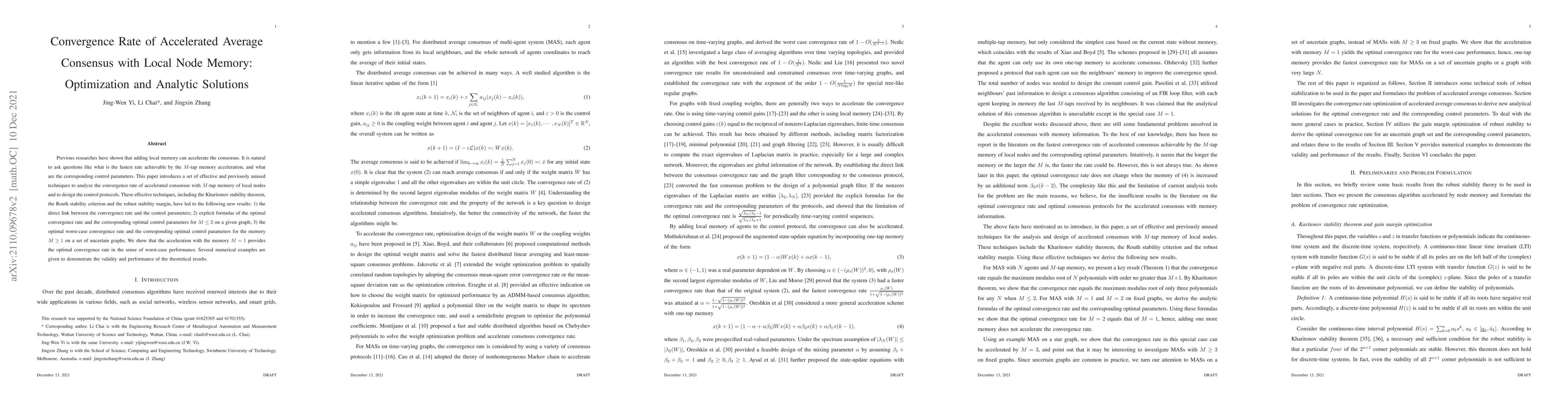 Previous researches have shown that adding local memory can accelerate the consensus. It is natural to ask questions like what is the fastest rate achievable by the $M$-tap memory acceleration, and what are the corresponding control parameters. This paper introduces a set of effective and previously unused techniques to analyze the convergence rate of accelerated consensus with $M$-tap memory of local nodes and to design the control protocols. These effective techniques, including the Kharitonov stability theorem, the Routh stability criterion and the robust stability margin, have led to the following new results: 1) the direct link between the convergence rate and the control parameters; 2) explicit formulas of the optimal convergence rate and the corresponding optimal control parameters for $M \leq 2$ on a given graph; 3) the optimal worst-case convergence rate and the corresponding optimal control parameters for the memory $M \geq 1$ on a set of uncertain graphs. We show that the acceleration with the memory $M = 1$ provides the optimal convergence rate in the sense of worst-case performance. Several numerical examples are given to demonstrate the validity and performance of the theoretical results.