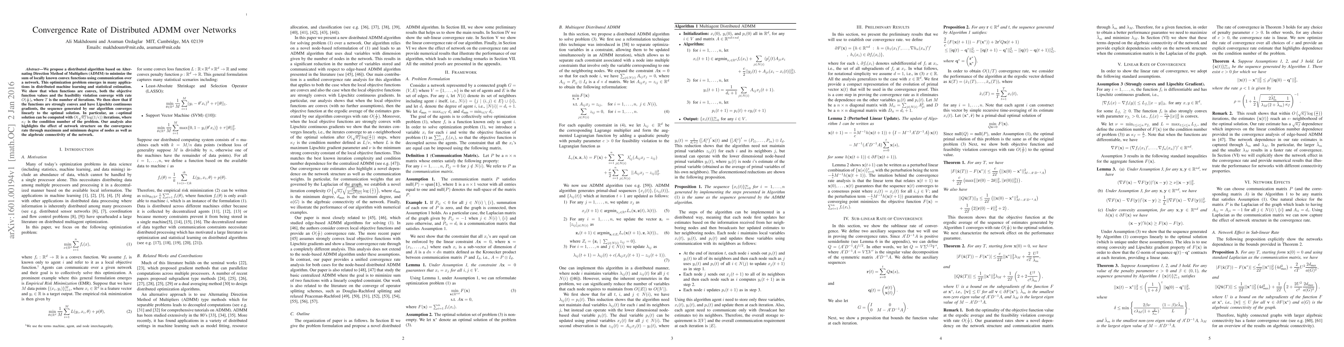 We propose a distributed algorithm based on Alternating Direction Method of Multipliers (ADMM) to minimize the sum of locally known convex functions using communication over a network. This optimization problem emerges in many applications in distributed machine learning and statistical estimation. We show that when functions are convex, both the objective function values and the feasibility violation converge with rate $O(\frac{1}{T})$, where $T$ is the number of iterations. We then show that if the functions are strongly convex and have Lipschitz continuous gradients, the sequence generated by our algorithm converges linearly to the optimal solution. In particular, an $\epsilon$-optimal solution can be computed with $O(\sqrt{\kappa_f} \log (1/\epsilon))$ iterations, where $\kappa_f$ is the condition number of the problem. Our analysis also highlights the effect of network structure on the convergence rate through maximum and minimum degree of nodes as well as the algebraic connectivity of the network.