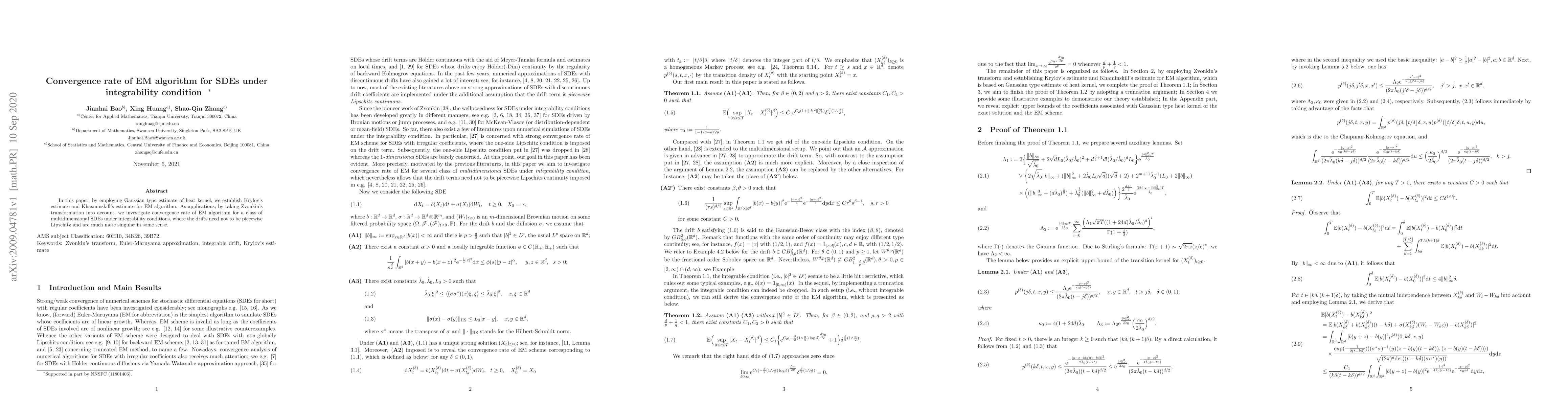 In this paper, by employing Gaussian type estimate of heat kernel, we establish Krylov's estimate and Khasminskill's estimate for EM algorithm. As applications, by taking Zvonkin's transformation into account, we investigate convergence rate of EM algorithm for a class of multidimensional SDEs under integrability conditions, where the drifts need not to be piecewise Lipschitz and are much more singular in some sense.