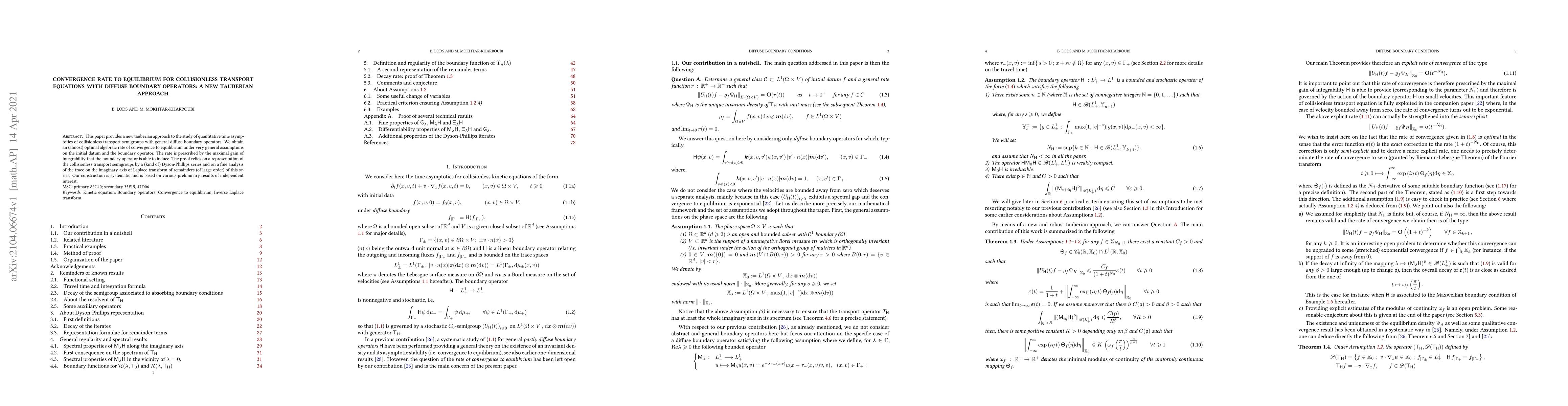 This paper provides a new tauberian approach to the study of quantitative time asymptotics of collisionless transport semigroups with general diffuse boundary operators. We obtain an (almost) optimal algebraic rate of convergence to equilibrium under very general assumptions on the initial datum and the boundary operator. The rate is prescribed by the maximal gain of integrability that the boundary operator is able to induce. The proof relies on a representation of the collisionless transport semigroups by a (kind of) Dyson-Phillips series and on a fine analysis of the trace on the imaginary axis of Laplace transform of remainders (of large order) of this series. Our construction is systematic and is based on various preliminary results of independent interest.