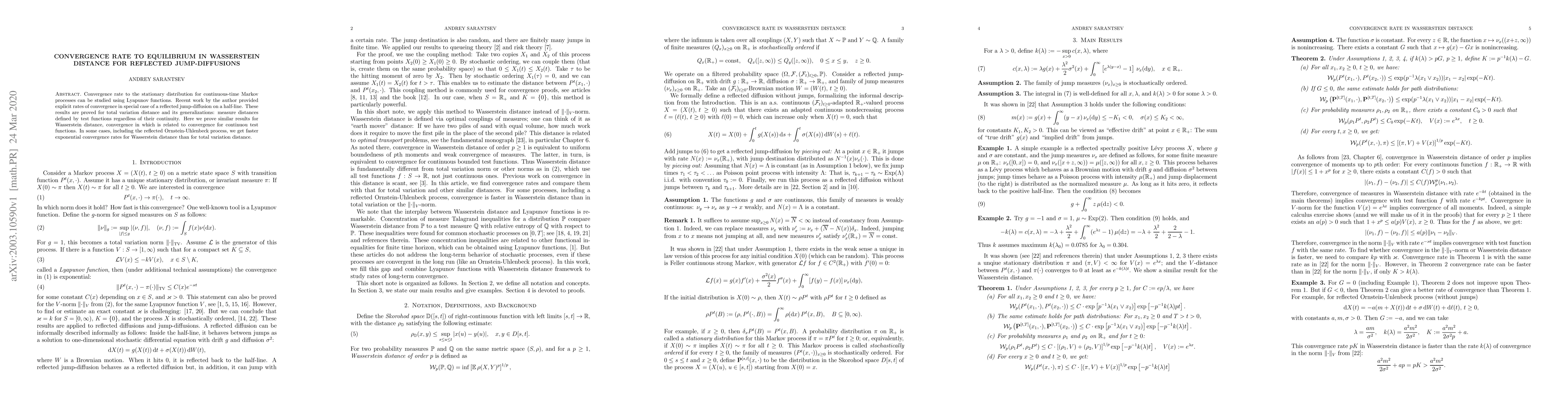 Convergence rate to the stationary distribution for continuous-time Markov processes can be studied using Lyapunov functions. Recent work by the author provided explicit rates of convergence in special case of a reflected jump-diffusion on a half-line. These results are proved for total variation distance and its generalizations: measure distances defined by test functions regardless of their continuity. Here we prove similar results for Wasserstein distance, convergence in which is related to convergence for continuou test functions. In some cases, including the reflected Ornstein-Uhlenbeck process, we get faster exponential convergence rates for Wasserstein distance than for total variation distance.