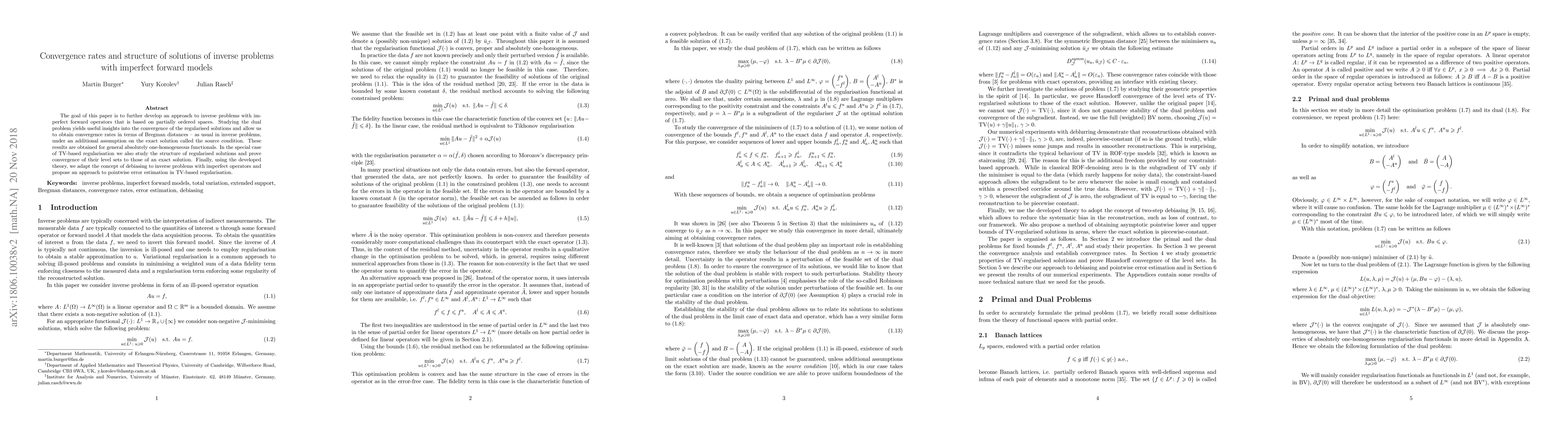 This paper develops an approach for inverse problems with imperfect forward models using partially ordered spaces, deriving convergence rates for regularised solutions in terms of Bregman distances under source conditions. It also examines the structure of TV-based regularised solutions and proposes a method for pointwise error estimation.