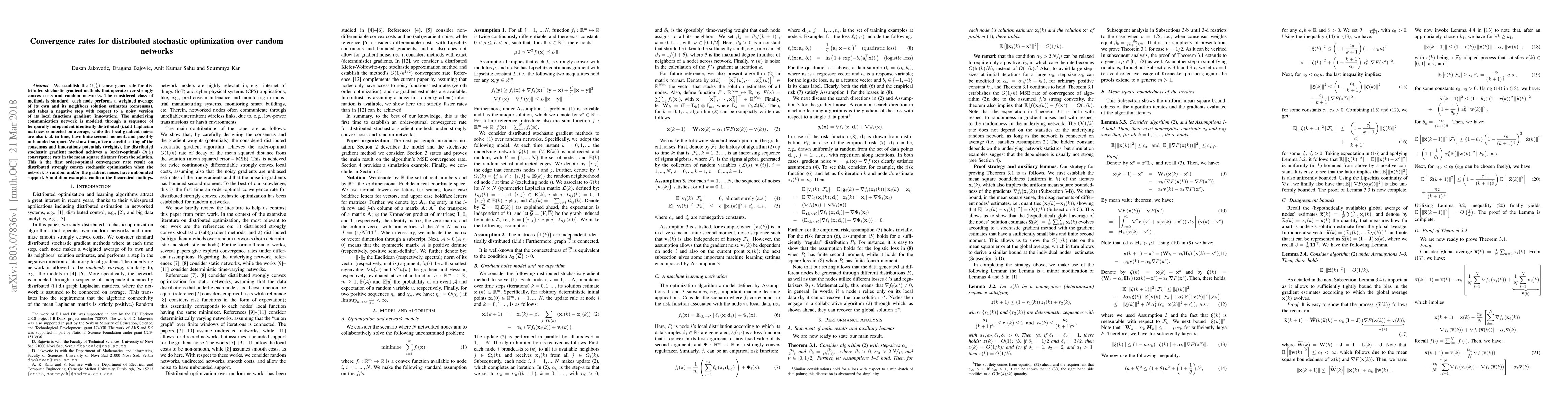 This paper establishes an O($\frac{1}{k}$) convergence rate for distributed stochastic gradient methods over random networks, showing optimal performance under strongly convex costs and random network topologies. The method combines consensus averaging and stochastic gradient updates, achieving optimal convergence despite unbounded gradient noise.