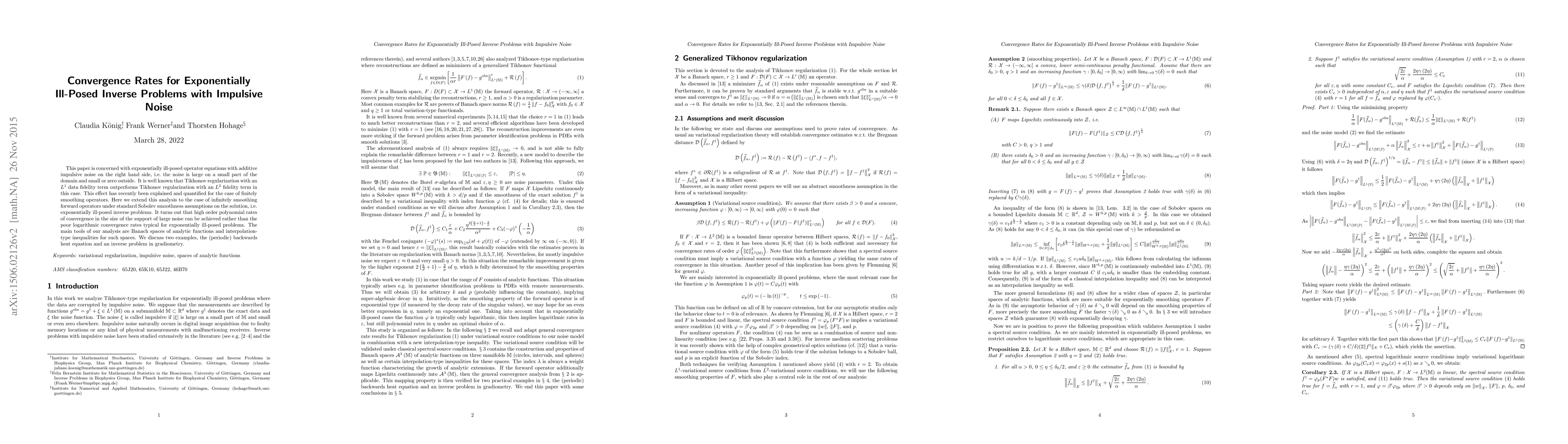 This paper investigates convergence rates for exponentially ill-posed inverse problems with impulsive noise, demonstrating that Tikhonov regularization with an $L^1$ fidelity term achieves high-order polynomial convergence rates, surpassing the typical logarithmic rates. The analysis extends to infinitely smoothing operators using Banach spaces and interpolation inequalities.