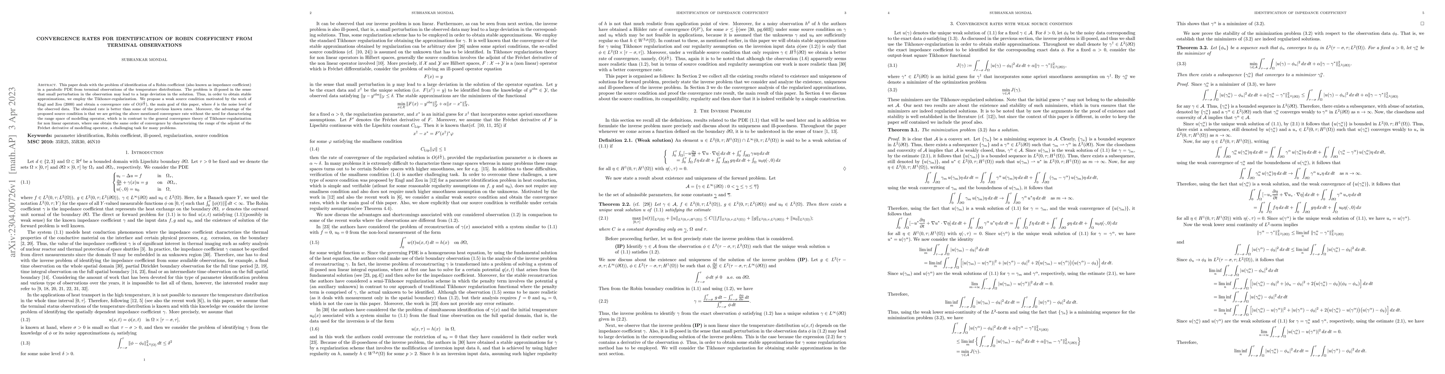This paper addresses the identification of a Robin coefficient in a parabolic PDE using terminal temperature observations, employing Tikhonov-regularization for stability. It proposes a weak source condition to achieve a convergence rate of $O(\d^\frac{1}{2})$, outperforming previous rates and avoiding the challenging task of characterizing the range space of the modelling operator.