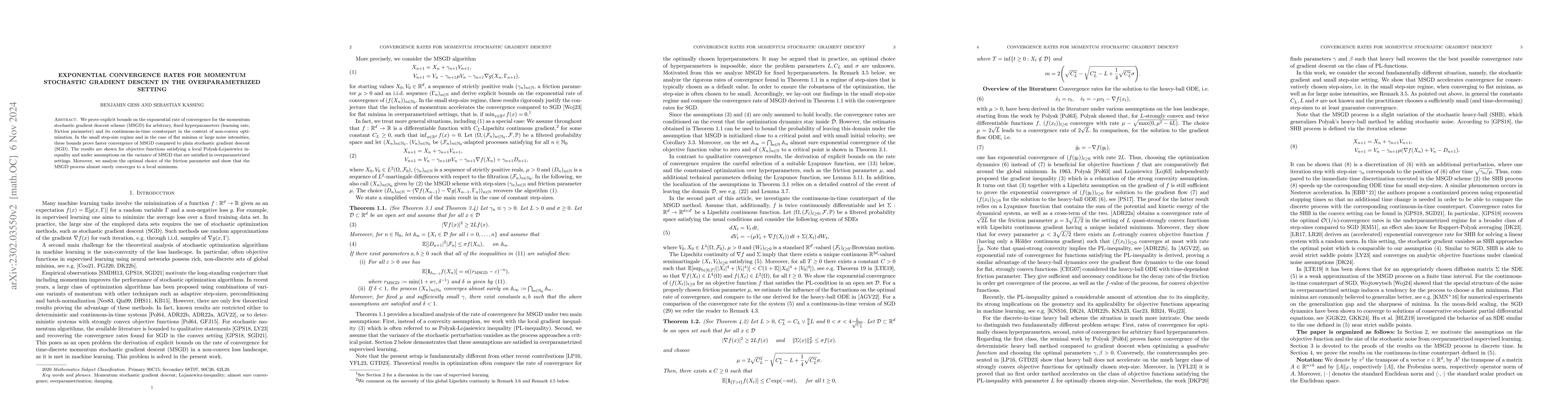 We consider the momentum stochastic gradient descent scheme (MSGD) and its continuous-in-time counterpart in the context of non-convex optimization. We show almost sure exponential convergence of the objective function value for target functions that are Lipschitz continuous and satisfy the Polyak-Lojasiewicz inequality on the relevant domain, and under assumptions on the stochastic noise that are motivated by overparameterized supervised learning applications. Moreover, we optimize the convergence rate over the set of friction parameters and show that the MSGD process almost surely converges.