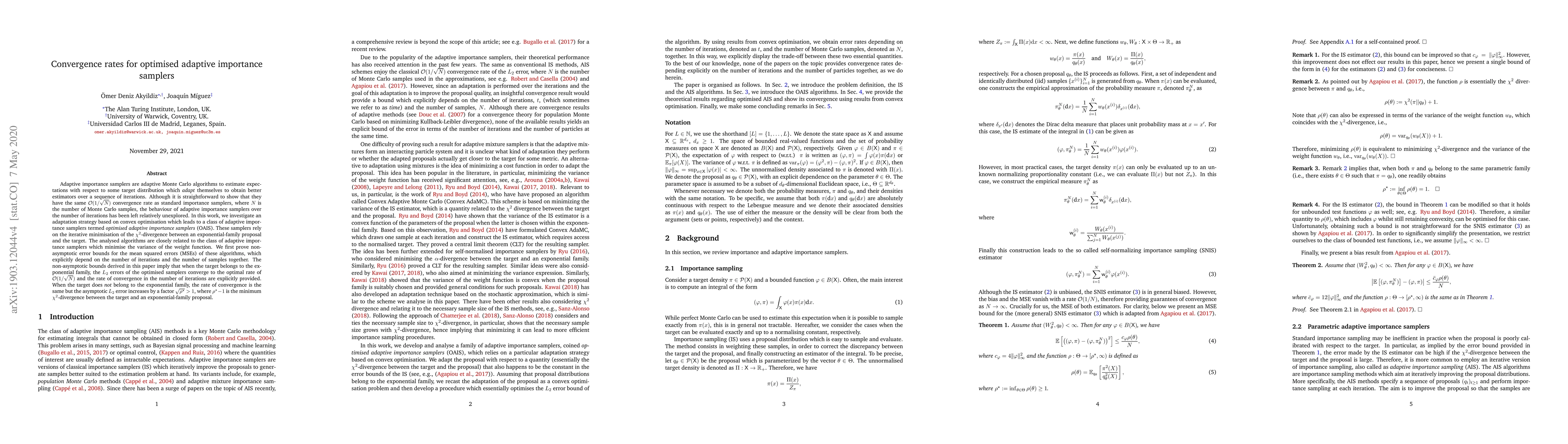 This paper investigates optimised adaptive importance samplers (OAIS) that adapt through convex optimisation to improve Monte Carlo estimation. The study proves non-asymptotic error bounds for these samplers, showing that they achieve the optimal convergence rate of $\mathcal{O}(1/\sqrt{N})$ for targets in the exponential family, while providing explicit rates of convergence for both iterations and samples.