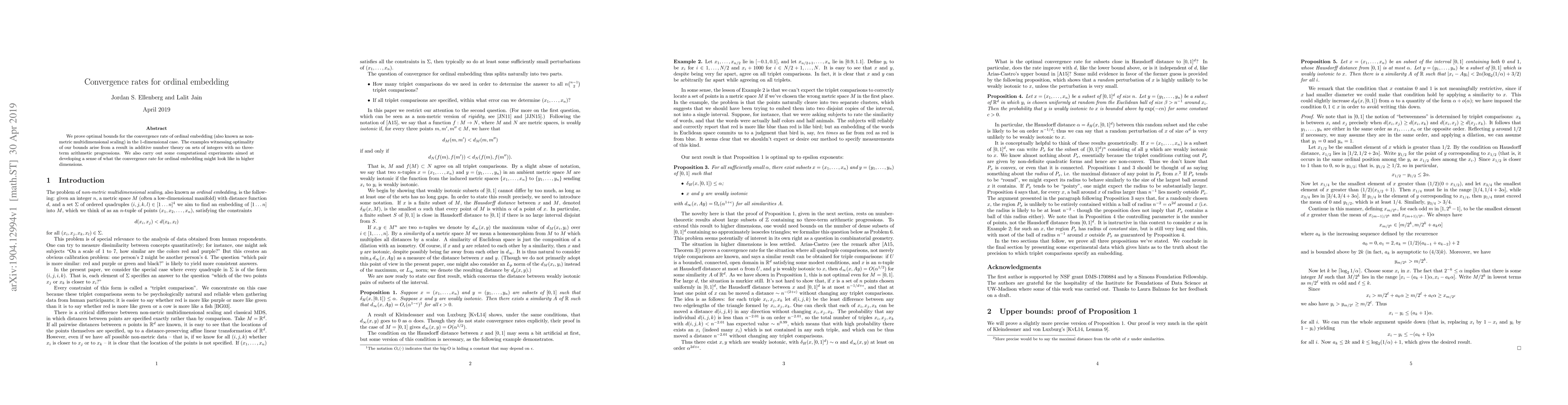 The paper proves optimal bounds for the convergence rate of ordinal embedding (non-metric multidimensional scaling) in the 1-dimensional case using results from additive number theory. Computational experiments are conducted to explore convergence rates in higher dimensions.