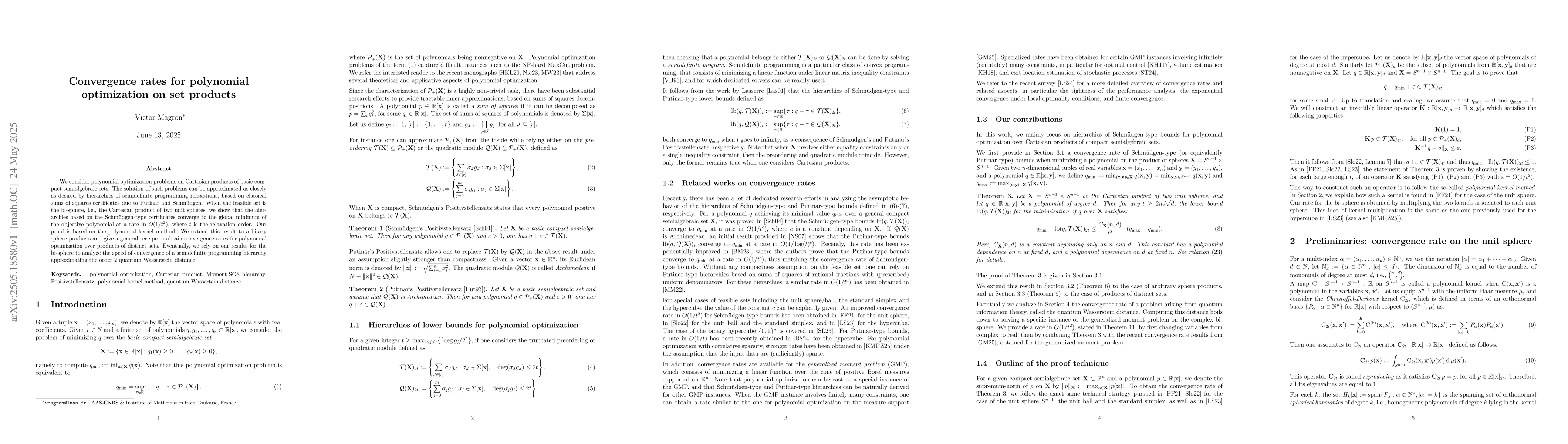 A research paper finds that polynomial optimization problems on sets of spheres can be approximated to a desired level using semidefinite programming relaxations, with convergence rates of $O(1/t^2)$ for the bi-sphere case.