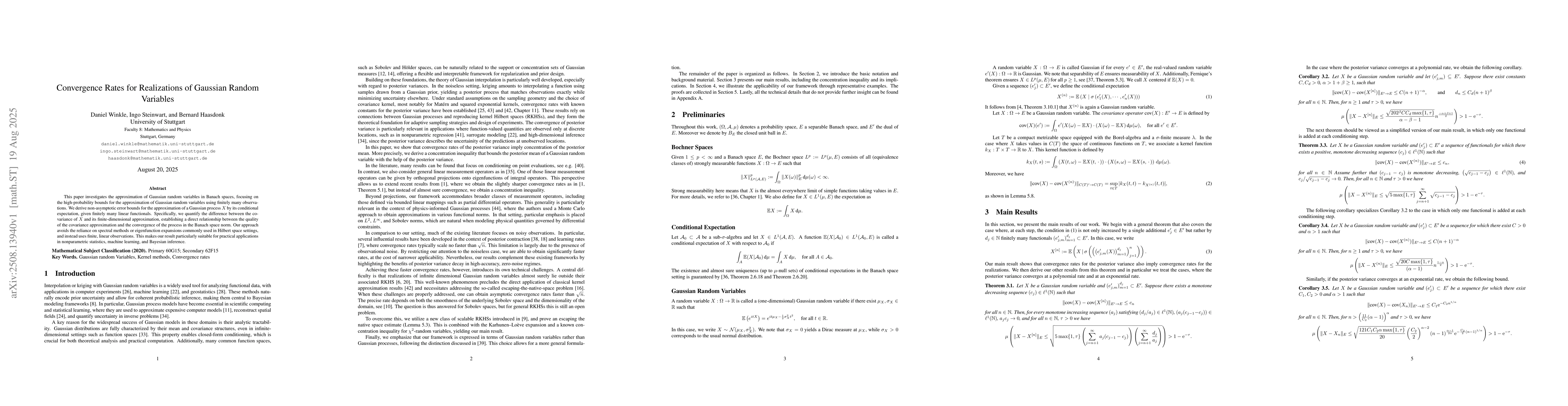 This paper investigates the approximation of Gaussian random variables in Banach spaces, focusing on the high-probability bounds for the approximation of Gaussian random variables using finitely many observations. We derive non-asymptotic error bounds for the approximation of a Gaussian process $ X $ by its conditional expectation, given finitely many linear functionals. Specifically, we quantify the difference between the covariance of $ X $ and its finite-dimensional approximation, establishing a direct relationship between the quality of the covariance approximation and the convergence of the process in the Banach space norm. Our approach avoids the reliance on spectral methods or eigenfunction expansions commonly used in Hilbert space settings, and instead uses finite, linear observations. This makes our result particularly suitable for practical applications in nonparametric statistics, machine learning, and Bayesian inference.