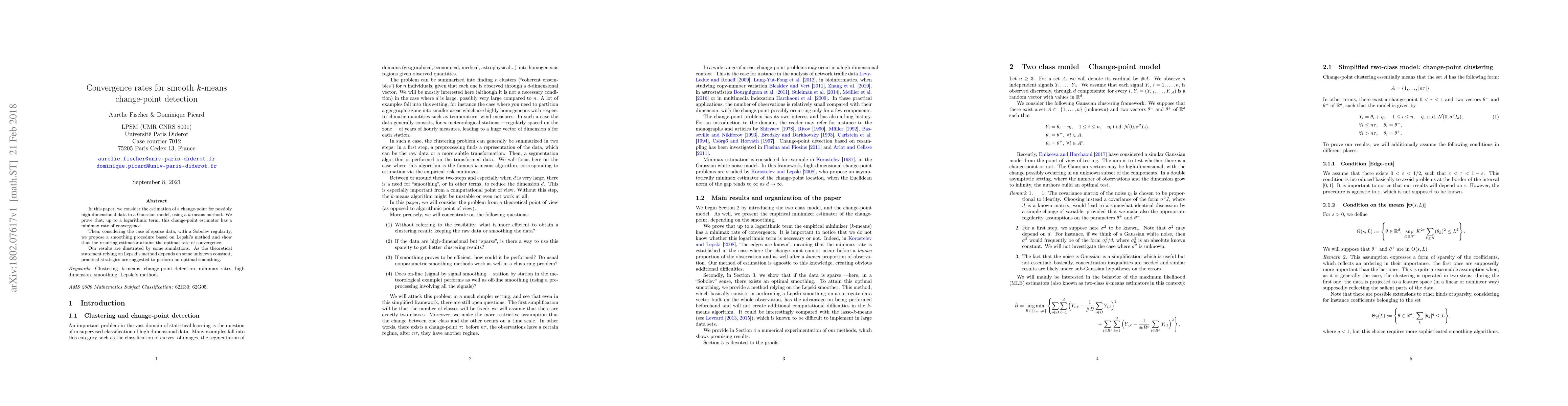 In this paper, we consider the estimation of a change-point for possibly high-dimensional data in a Gaussian model, using a k-means method. We prove that, up to a logarithmic term, this change-point estimator has a minimax rate of convergence. Then, considering the case of sparse data, with a Sobolev regularity, we propose a smoothing procedure based on Lepski's method and show that the resulting estimator attains the optimal rate of convergence. Our results are illustrated by some simulations. As the theoretical statement relying on Lepski's method depends on some unknown constant, practical strategies are suggested to perform an optimal smoothing.