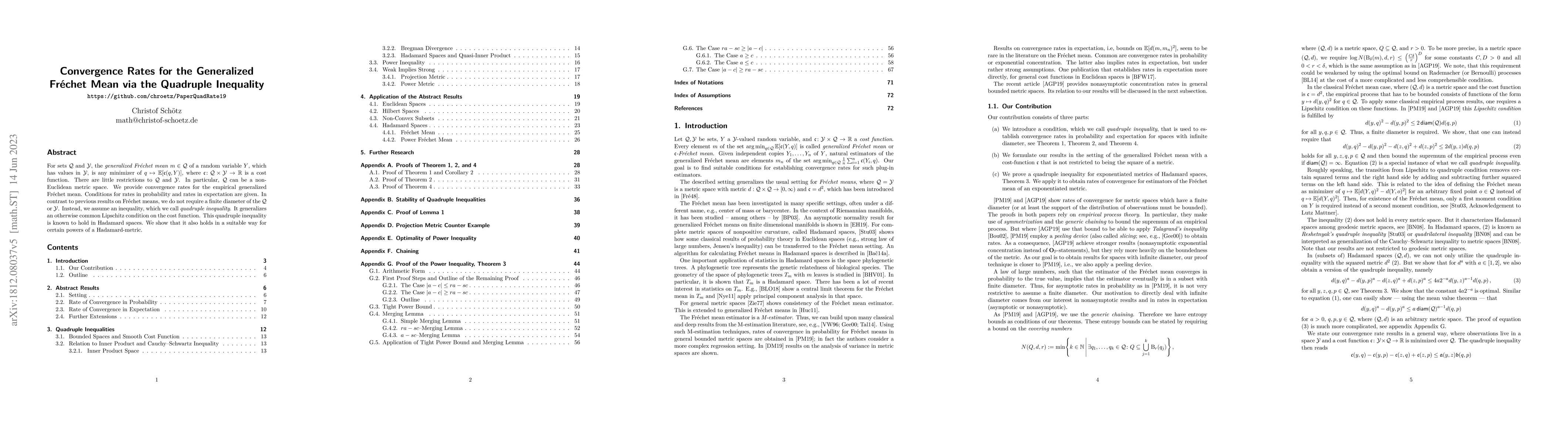 This paper investigates convergence rates for the generalized Fréchet mean under the quadruple inequality, providing conditions for both probabilistic and expected convergence. Unlike previous studies, it does not require a finite diameter for the metric space, instead relying on a generalized Lipschitz condition applicable to Hadamard spaces.