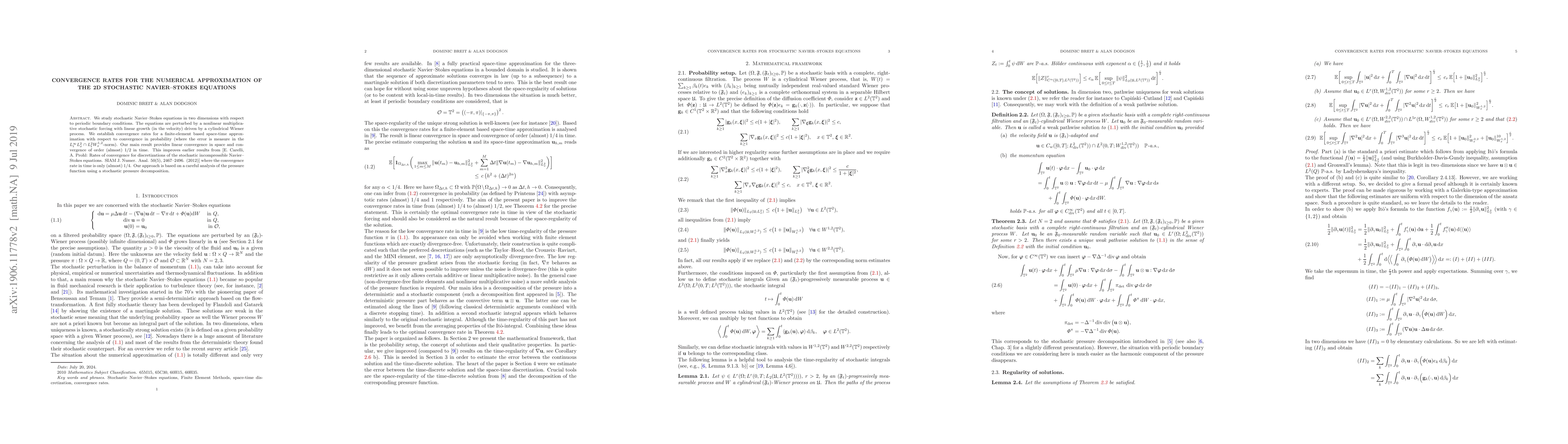 We study stochastic Navier-Stokes equations in two dimensions with respect to periodic boundary conditions. The equations are perturbed by a nonlinear multiplicative stochastic forcing with linear growth (in the velocity) driven by a cylindrical Wiener process. We establish convergence rates for a finite-element based space-time approximation with respect to convergence in probability (where the error is measure in the $L^\infty_tL^2_x\cap L^2_tW^{1,2}_x$-norm). Our main result provides linear convergence in space and convergence of order (almost) 1/2 in time. This improves earlier results from [E. Carelli, A. Prohl: Rates of convergence for discretizations of the stochastic incompressible Navier-Stokes equations. SIAM J. Numer. Anal. 50(5), 2467-2496. (2012)] where the convergence rate in time is only (almost) 1/4. Our approach is based on a careful analysis of the pressure function using a stochastic pressure decomposition.