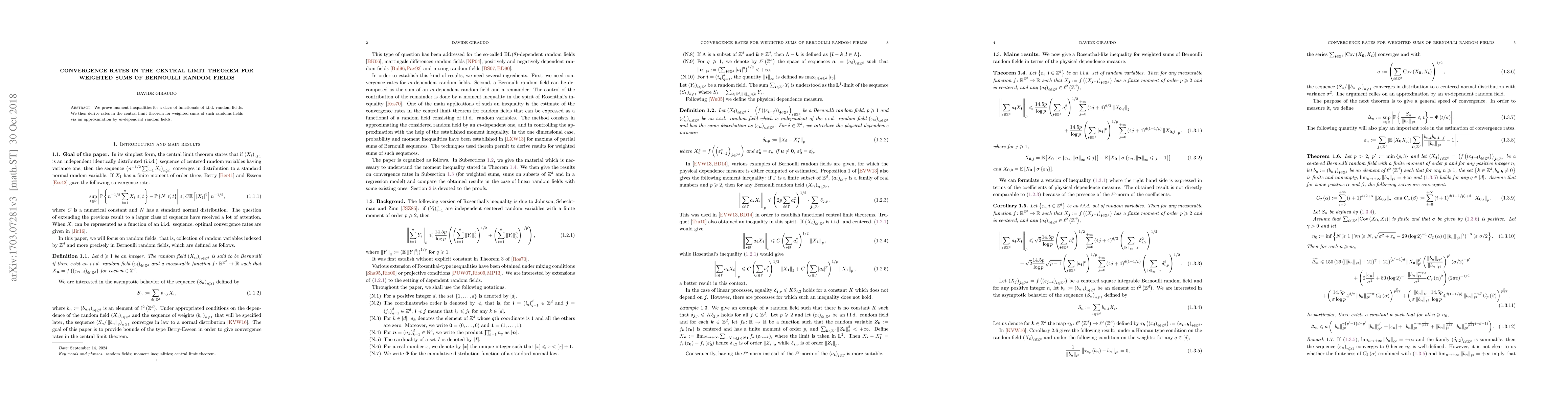 Summary: This paper establishes moment inequalities for independent and identically distributed Bernoulli random fields and derives the convergence rates in the central limit theorem for their weighted sums, using an approximation by $m$-dependent random fields.