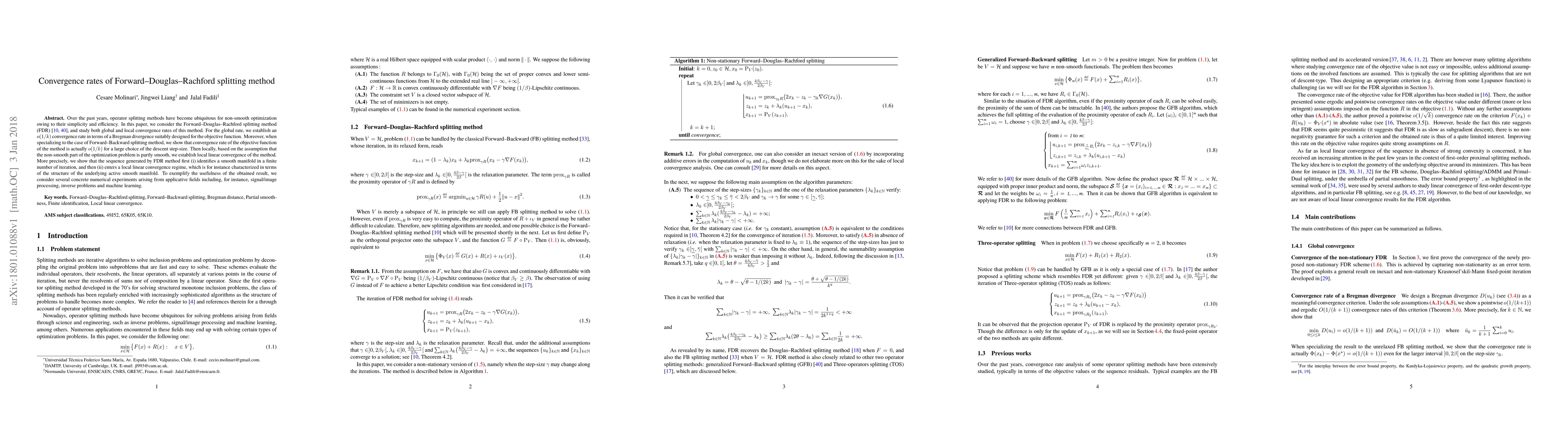 Over the past years, operator splitting methods have become ubiquitous for non-smooth optimization owing to their simplicity and efficiency. In this paper, we consider the Forward--Douglas--Rachford splitting method (FDR) [10,40], and study both global and local convergence rates of this method. For the global rate, we establish an $o(1/k)$ convergence rate in terms of a Bregman divergence suitably designed for the objective function. Moreover, when specializing to the case of Forward--Backward splitting method, we show that convergence rate of the objective function of the method is actually $o(1/k)$ for a large choice of the descent step-size. Then locally, based on the assumption that the non-smooth part of the optimization problem is partly smooth, we establish local linear convergence of the method. More precisely, we show that the sequence generated by FDR method first (i) identifies a smooth manifold in a finite number of iteration, and then (ii) enters a local linear convergence regime, which is for instance characterized in terms of the structure of the underlying active smooth manifold. To exemplify the usefulness of the obtained result, we consider several concrete numerical experiments arising from applicative fields including, for instance, signal/image processing, inverse problems and machine learning.