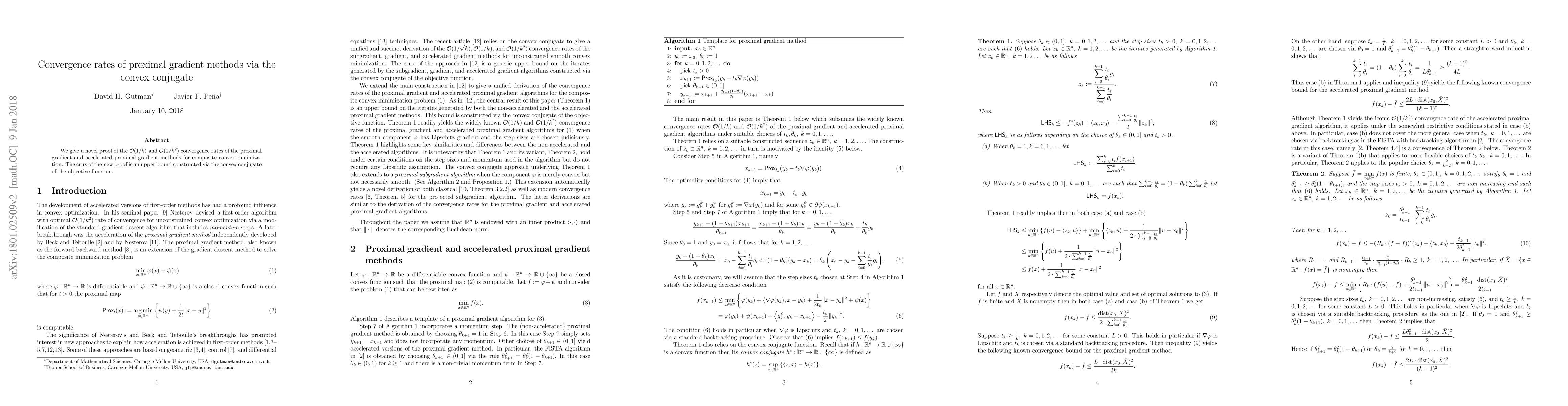 This paper presents a new proof for the convergence rates of $O(1/k)$ and $O(1/k^2)$ in proximal gradient methods, leveraging an upper bound derived through the convex conjugate of the objective function. The method enhances the understanding of these optimization algorithms' efficiency.