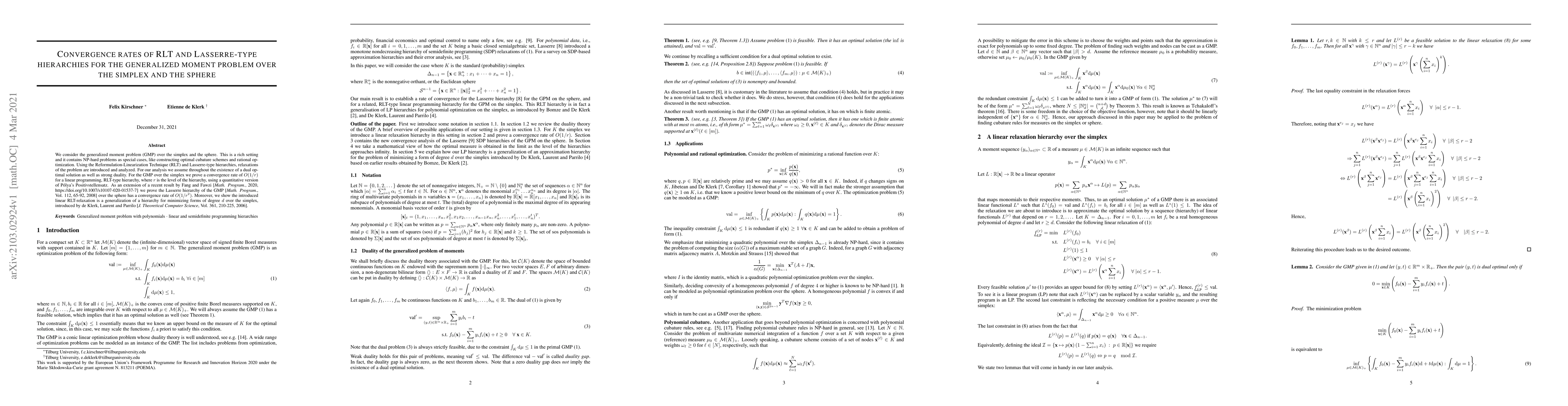 This paper analyzes convergence rates for RLT and Lasserre-type hierarchies in solving the generalized moment problem over the simplex and the sphere. It proves a convergence rate of $O(1/r)$ for the RLT hierarchy over the simplex and $O(1/r^2)$ for the Lasserre hierarchy over the sphere, extending previous results and showing the RLT-relaxation's generalization capabilities.