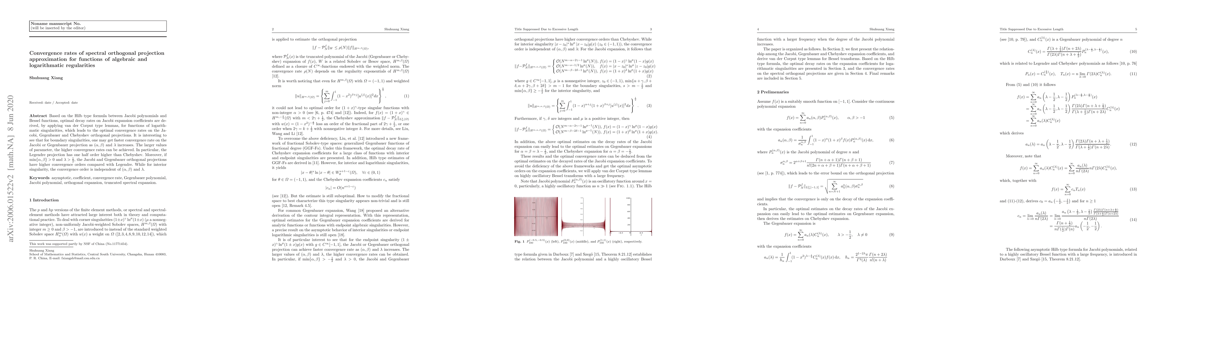 This paper derives optimal convergence rates for spectral orthogonal projection approximations using Jacobi, Gegenbauer, and Chebyshev polynomials, leveraging the Hilb type formula and van der Corput lemmas. It finds that higher convergence rates are achieved for boundary singularities with increasing parameters, while interior singularities show convergence rates independent of these parameters.