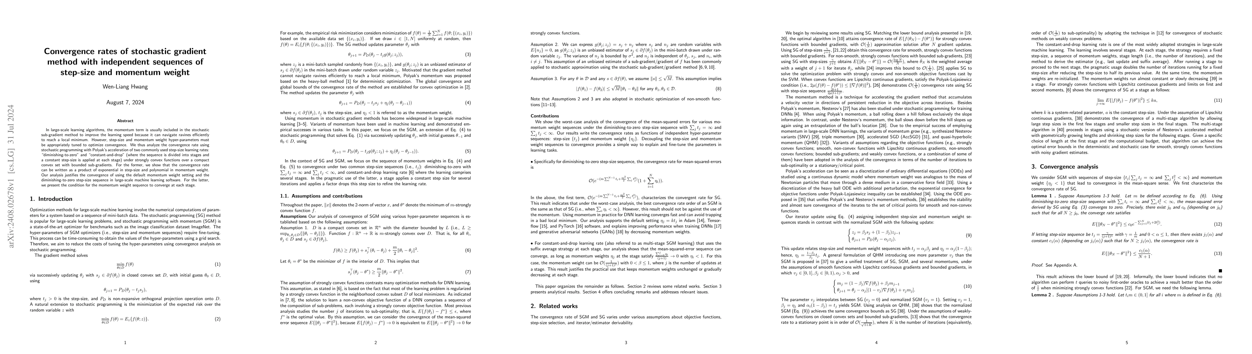 This paper analyzes convergence rates of the stochastic gradient method with varying step-size and momentum weight sequences under strongly convex functions. It shows that a diminishing-to-zero step-size with default momentum weight leads to efficient convergence, while a constant-and-drop step-size requires specific conditions for momentum weight to converge.