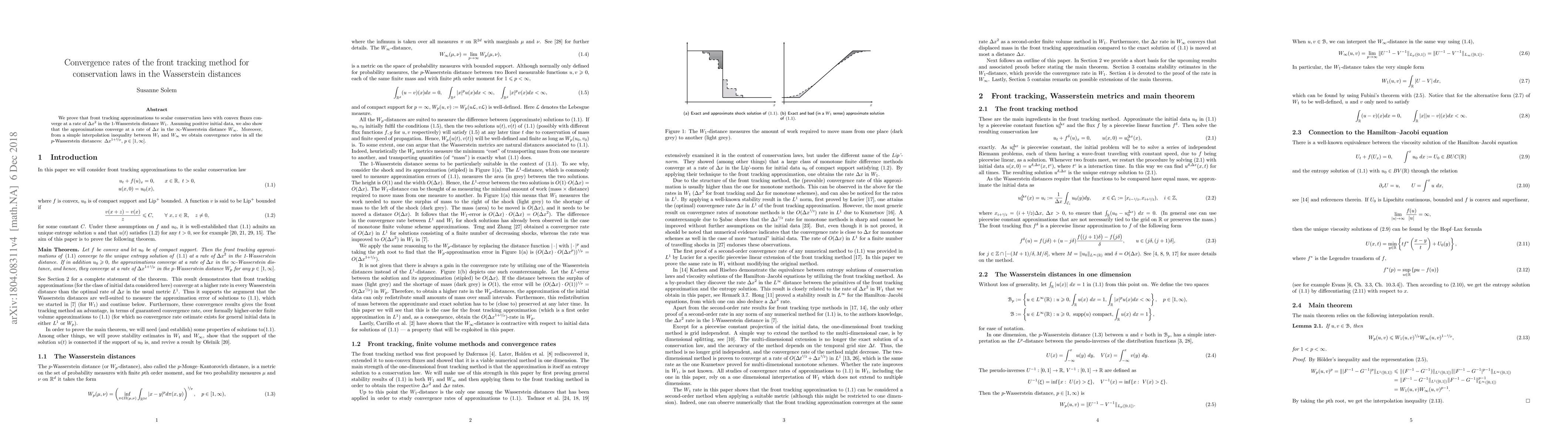 The paper establishes convergence rates for front tracking methods applied to scalar conservation laws, showing $\Delta x^2$ convergence in $W_1$ and $\Delta x$ in $W_\infty$ for positive initial data, and deriving $\Delta x^{1+1/p}$ convergence for all $p$-Wasserstein distances through interpolation.