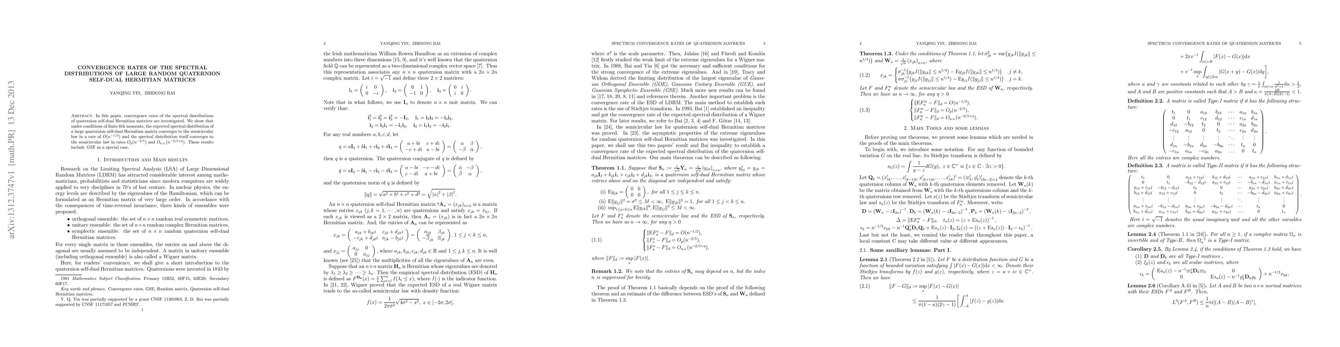 In this paper, convergence rates of the spectral distributions of quaternion self-dual Hermitian matrices are investigated. We show that under conditions of finite 6th moments, the expected spectral distribution of a large quaternion self-dual Hermitian matrix converges to the semicircular law in a rate of $O(n^{-1/2})$ and the spectral distribution itself converges to the semicircular law in rates $O_p(n^{-2/5})$ and $O_{a.s.}(n^{-2/5+\eta})$. Those results include GSE as a special case.
