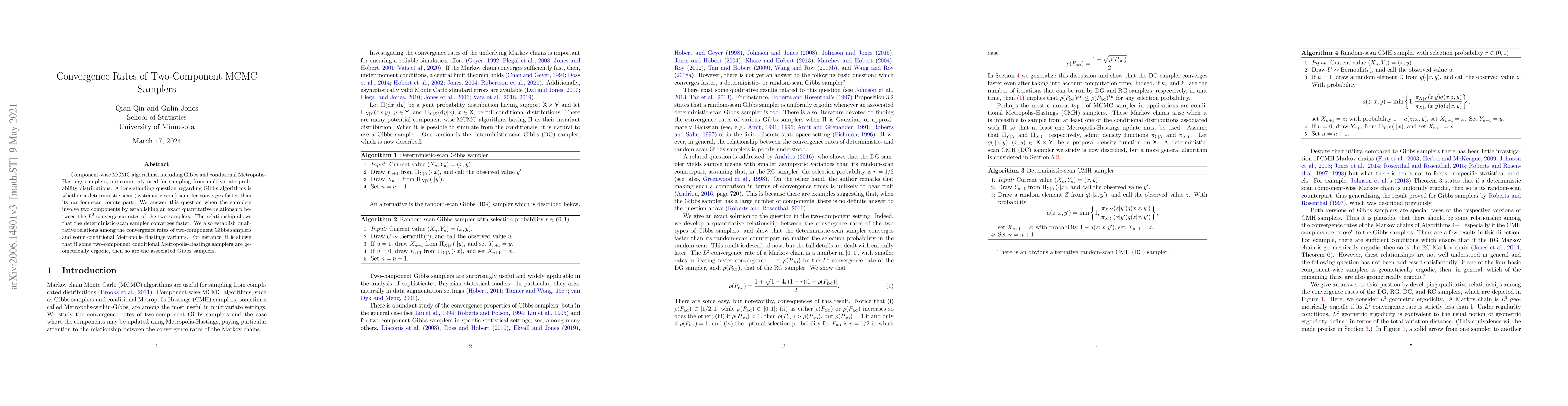 This paper establishes an exact quantitative relationship between the $L^2$ convergence rates of deterministic-scan and random-scan two-component MCMC samplers, showing that the deterministic-scan sampler converges faster. It also explores qualitative relations among the convergence rates of two-component Gibbs samplers and conditional Metropolis-Hastings variants, proving that geometric ergodicity in certain Metropolis-Hastings samplers implies the same in associated Gibbs samplers.