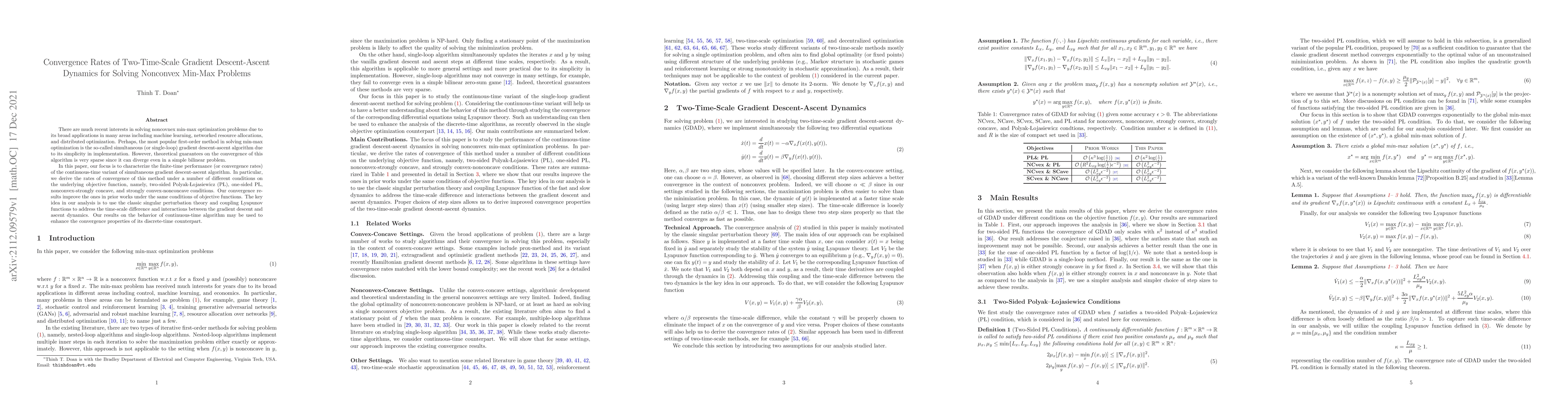 This paper investigates the convergence rates of a continuous-time variant of the simultaneous gradient descent-ascent algorithm for solving nonconvex min-max optimization problems. It improves prior convergence results under various objective function conditions using singular perturbation theory and coupling Lyapunov functions.