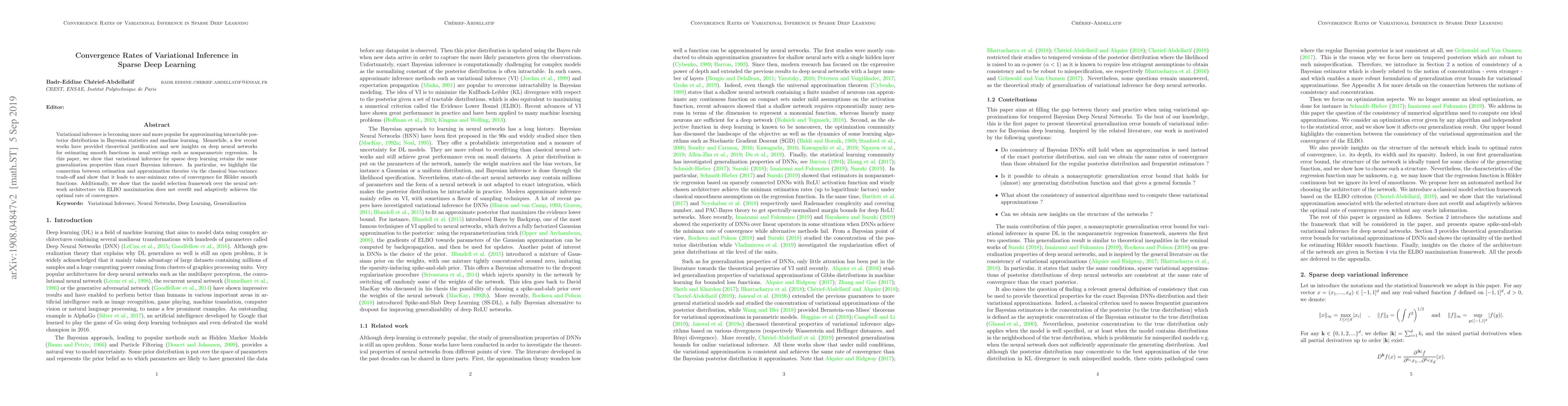 Variational inference is becoming more and more popular for approximating intractable posterior distributions in Bayesian statistics and machine learning. Meanwhile, a few recent works have provided theoretical justification and new insights on deep neural networks for estimating smooth functions in usual settings such as nonparametric regression. In this paper, we show that variational inference for sparse deep learning retains the same generalization properties than exact Bayesian inference. In particular, we highlight the connection between estimation and approximation theories via the classical bias-variance trade-off and show that it leads to near-minimax rates of convergence for H\"older smooth functions. Additionally, we show that the model selection framework over the neural network architecture via ELBO maximization does not overfit and adaptively achieves the optimal rate of convergence.