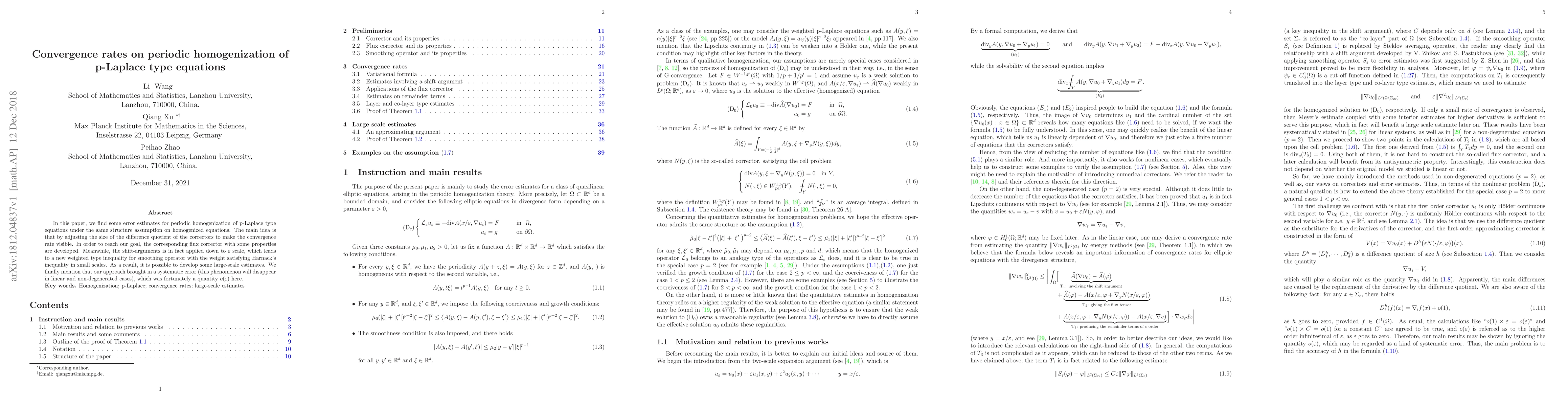 In this paper, we find some error estimates for periodic homogenization of p-Laplace type equations under the same structure assumption on homogenized equations. The main idea is that by adjusting the size of the difference quotient of the correctors to make the convergence rate visible. In order to reach our goal, the corresponding flux corrector with some properties are developed. Meanwhile, the shift-arguments is in fact applied down to $\varepsilon$ scale, which leads to a new weighted type inequality for smoothing operator with the weight satisfying Harnack's inequality in small scales. As a result, it is possible to develop some large-scale estimates. We finally mention that our approach brought in a systematic error (this phenomenon will disappear in linear and non-degenerated cases), which was fortunately a quantity $o(\varepsilon)$ here.