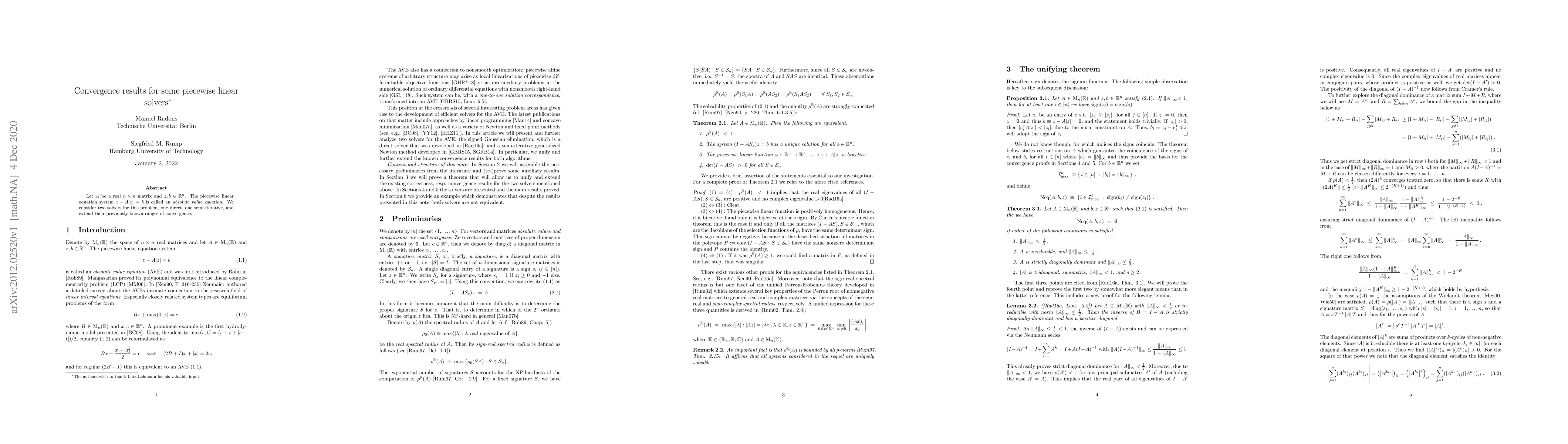 Let $A$ be a real $n\times n$ matrix and $z,b\in \mathbb R^n$. The piecewise linear equation system $z-A\vert z\vert = b$ is called an \textit{absolute value equation}. We consider two solvers for this problem, one direct, one semi-iterative, and extend their previously known ranges of convergence.