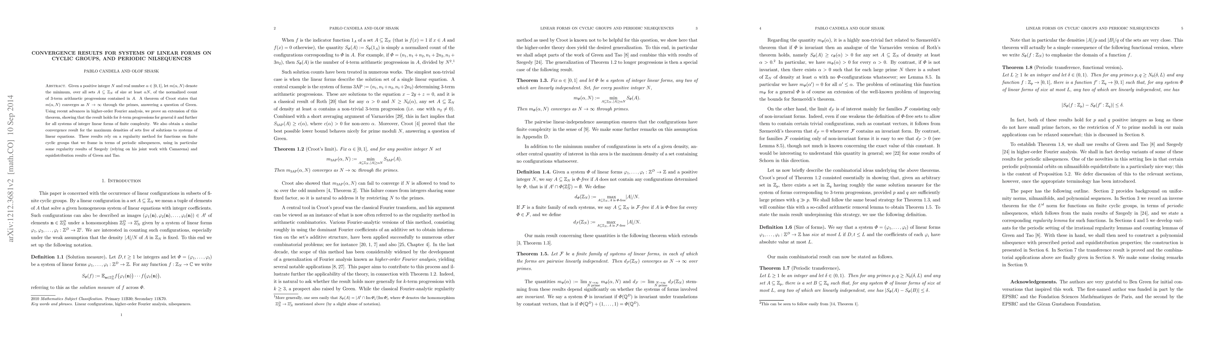 Given a positive integer $N$ and real number $\alpha\in [0, 1]$, let $m(\alpha,N)$ denote the minimum, over all sets $A\subset \mathbb{Z}/N\mathbb{Z}$ of size at least $\alpha N$, of the normalized count of 3-term arithmetic progressions contained in $A$. A theorem of Croot states that $m(\alpha,N)$ converges as $N\to\infty$ through the primes, answering a question of Green. Using recent advances in higher-order Fourier analysis, we prove an extension of this theorem, showing that the result holds for $k$-term progressions for general $k$ and further for all systems of integer linear forms of finite complexity. We also obtain a similar convergence result for the maximum densities of sets free of solutions to systems of linear equations. These results rely on a regularity method for functions on finite cyclic groups that we frame in terms of periodic nilsequences, using in particular some regularity results of Szegedy (relying on his joint work with Camarena) and equidistribution results of Green and Tao.