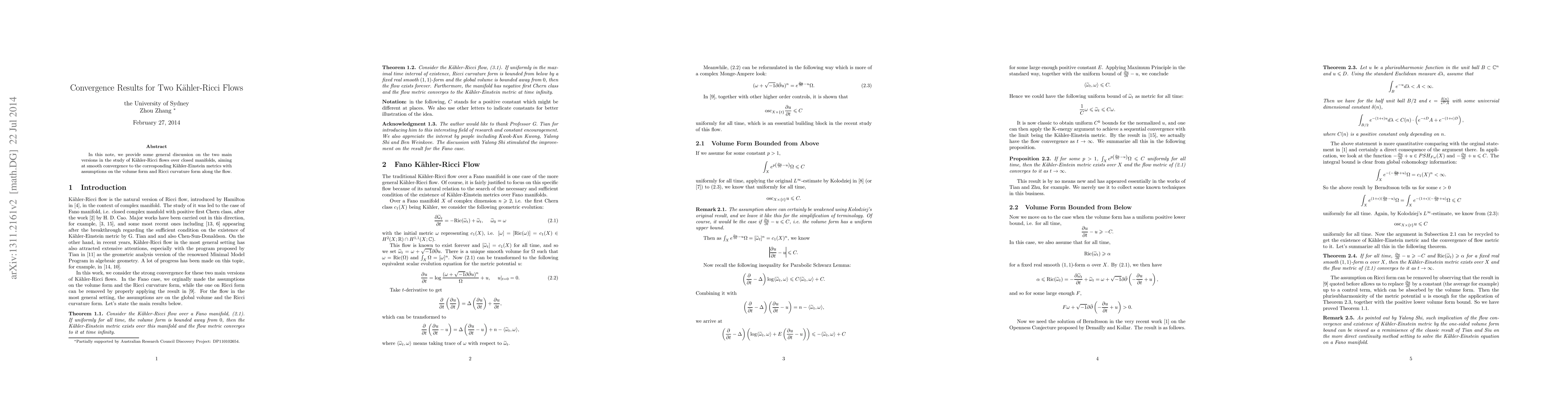 Summary: This paper discusses the convergence properties of two versions of Kähler-Ricci flows on closed manifolds, focusing on achieving smooth convergence to Kähler-Einstein metrics under conditions on volume and Ricci curvature forms. The study aims to clarify the underlying mechanisms for such convergence.