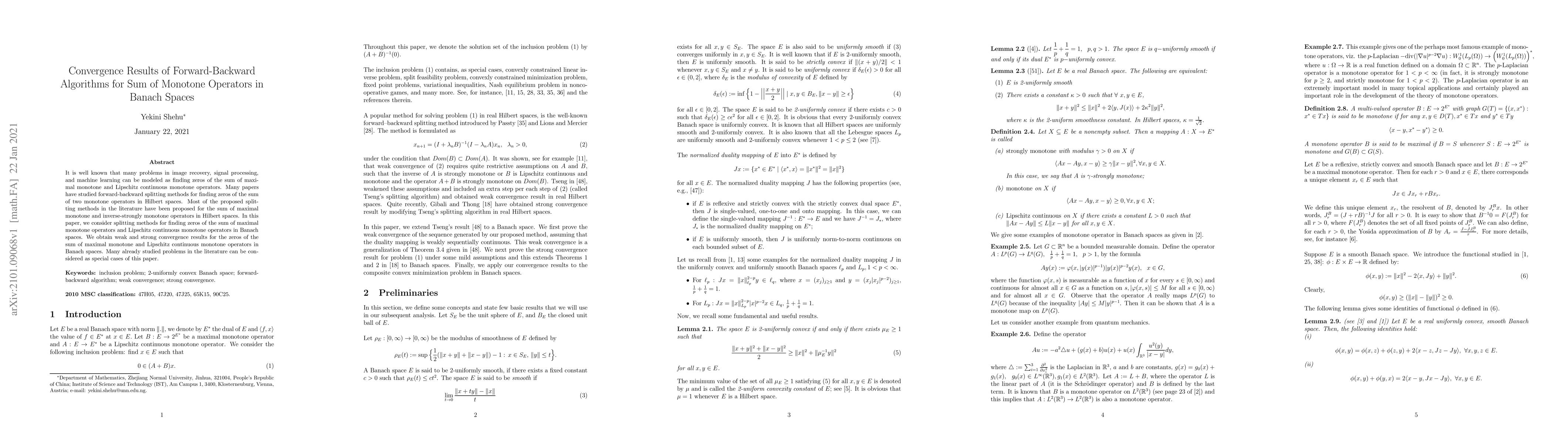 This paper investigates forward-backward splitting methods for finding zeros of the sum of maximal monotone and Lipschitz continuous monotone operators in Banach spaces, providing both weak and strong convergence results. It extends existing methods from Hilbert spaces to more general Banach spaces, encompassing various problems in image recovery, signal processing, and machine learning.