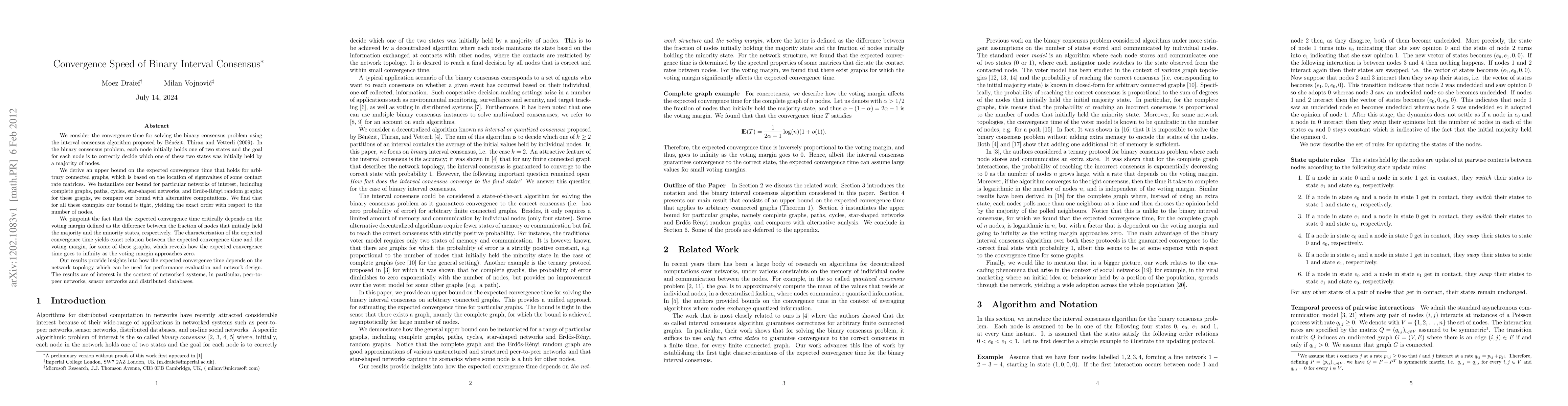 We consider the convergence time for solving the binary consensus problem using the interval consensus algorithm proposed by B\' en\' ezit, Thiran and Vetterli (2009). In the binary consensus problem, each node initially holds one of two states and the goal for each node is to correctly decide which one of these two states was initially held by a majority of nodes. We derive an upper bound on the expected convergence time that holds for arbitrary connected graphs, which is based on the location of eigenvalues of some contact rate matrices. We instantiate our bound for particular networks of interest, including complete graphs, paths, cycles, star-shaped networks, and Erd\" os-R\' enyi random graphs; for these graphs, we compare our bound with alternative computations. We find that for all these examples our bound is tight, yielding the exact order with respect to the number of nodes. We pinpoint the fact that the expected convergence time critically depends on the voting margin defined as the difference between the fraction of nodes that initially held the majority and the minority states, respectively. The characterization of the expected convergence time yields exact relation between the expected convergence time and the voting margin, for some of these graphs, which reveals how the expected convergence time goes to infinity as the voting margin approaches zero. Our results provide insights into how the expected convergence time depends on the network topology which can be used for performance evaluation and network design. The results are of interest in the context of networked systems, in particular, peer-to-peer networks, sensor networks and distributed databases.