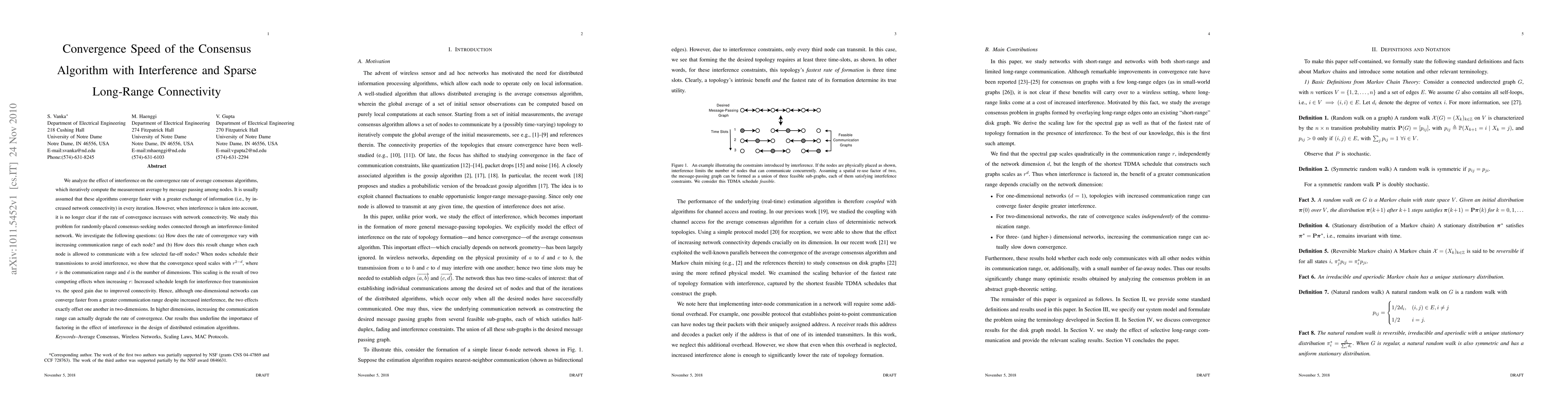 We analyze the effect of interference on the convergence rate of average consensus algorithms, which iteratively compute the measurement average by message passing among nodes. It is usually assumed that these algorithms converge faster with a greater exchange of information (i.e., by increased network connectivity) in every iteration. However, when interference is taken into account, it is no longer clear if the rate of convergence increases with network connectivity. We study this problem for randomly-placed consensus-seeking nodes connected through an interference-limited network. We investigate the following questions: (a) How does the rate of convergence vary with increasing communication range of each node? and (b) How does this result change when each node is allowed to communicate with a few selected far-off nodes? When nodes schedule their transmissions to avoid interference, we show that the convergence speed scales with $r^{2-d}$, where $r$ is the communication range and $d$ is the number of dimensions. This scaling is the result of two competing effects when increasing $r$: Increased schedule length for interference-free transmission vs. the speed gain due to improved connectivity. Hence, although one-dimensional networks can converge faster from a greater communication range despite increased interference, the two effects exactly offset one another in two-dimensions. In higher dimensions, increasing the communication range can actually degrade the rate of convergence. Our results thus underline the importance of factoring in the effect of interference in the design of distributed estimation algorithms.