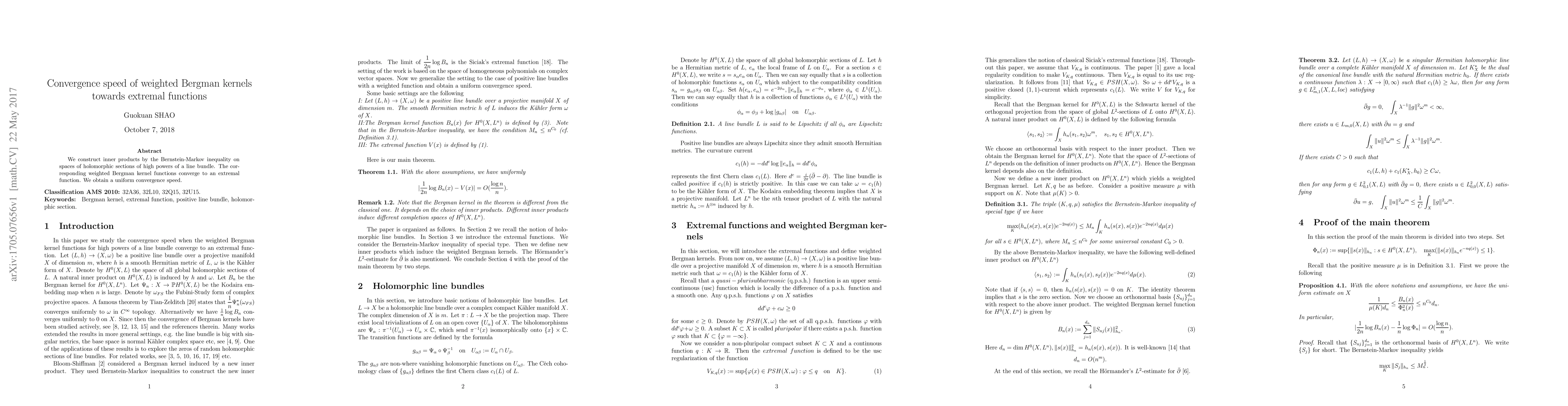 We construct inner products by the Bernstein-Markov inequality on spaces of holomorphic sections of high powers of a line bundle. The corresponding weighted Bergman kernel functions converge to an extremal function. We obtain a uniform convergence speed.